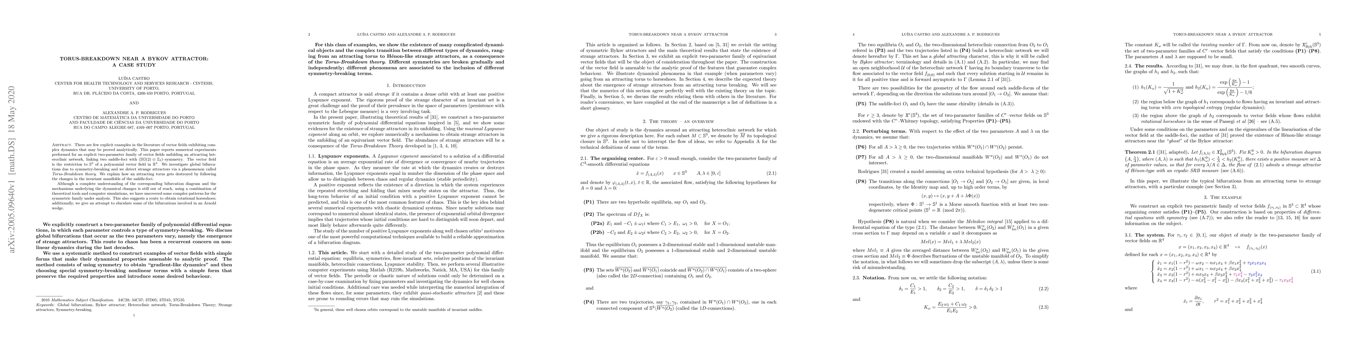 There are few explicit examples in the literature of vector fields exhibiting complex dynamics that may be proved analytically. This paper reports numerical experiments performed for an explicit two-parameter family of vector fields unfolding an attracting heteroclinic network, linking two saddle-foci with $ (\mathbb{SO}(2) \oplus \mathbb{Z}_2)$-symmetry. The vector field is the restriction to $\mathbb{S}^3$ of a polynomial vector field in $\mathbb{R}^4$. We investigate global bifurcations due to symmetry-breaking and we detect strange attractors via a phenomenon called Torus-Breakdown theory. We explain how an attracting torus gets destroyed by following the changes in the invariant manifolds of the saddle-foci. Although a complete understanding of the corresponding bifurcation diagram and the mechanisms underlying the dynamical changes is still out of reach, using a combination of theoretical tools and computer simulations, we have uncovered some complex patterns for the symmetric family under analysis. This also suggests a route to obtain rotational horseshoes; additionally, we give an attempt to elucidate some of the bifurcations involved in an Arnold wedge.