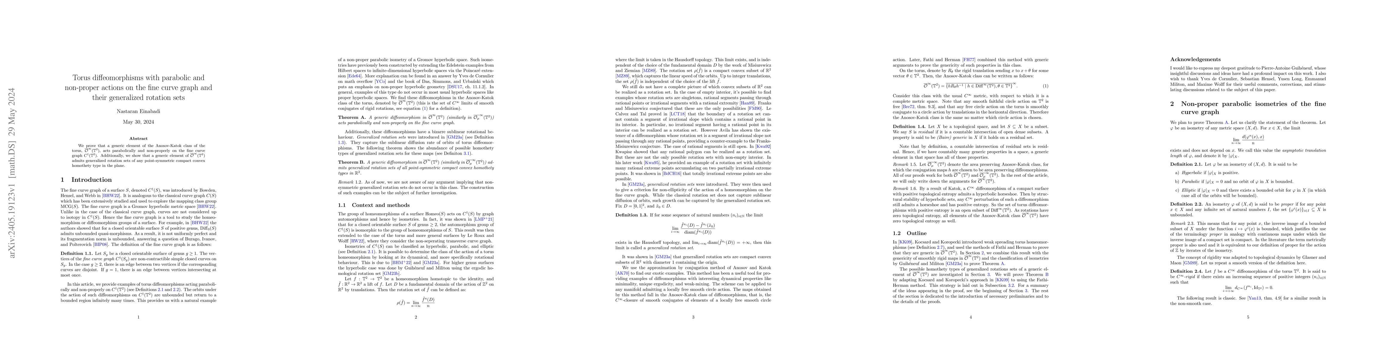 We prove that a generic element of the Anosov-Katok class of the torus, $\overline{\mathcal{O}}^{\infty}(\mathbb{T}^2)$, acts parabolically and non-properly on the fine curve graph $C^{\dagger}(\mathbb{T}^2)$. Additionally, we show that a generic element of $\overline{\mathcal{O}}^{\infty}(\mathbb{T}^2)$ admits generalized rotation sets of any point-symmetric compact convex homothety type in the plane.