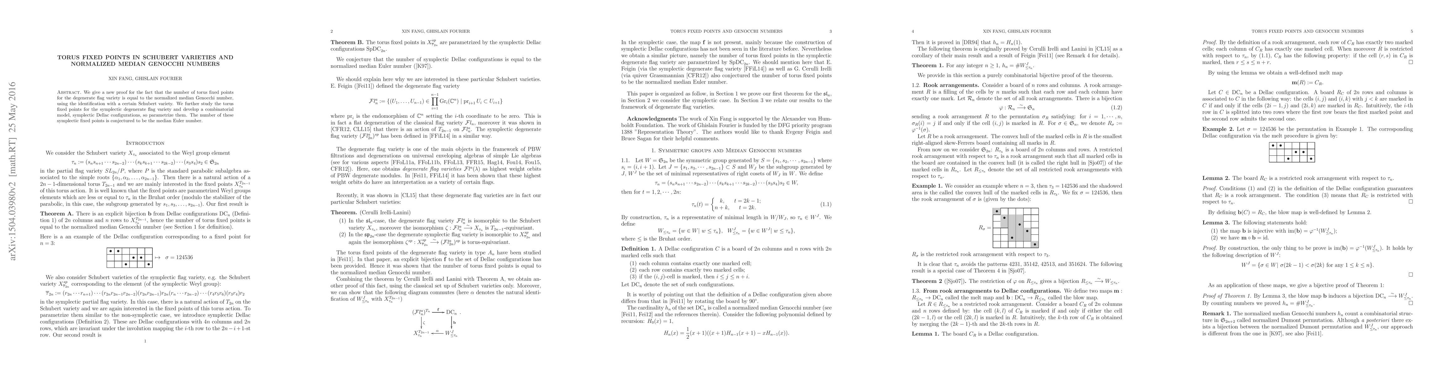 This paper provides a new proof linking the number of torus fixed points in the degenerated flag variety to normalized median Genocchi numbers via Schubert varieties. It also introduces a combinatorial model for torus fixed points in the symplectic degenerated flag variety, hypothesizing they correspond to median Euler numbers.