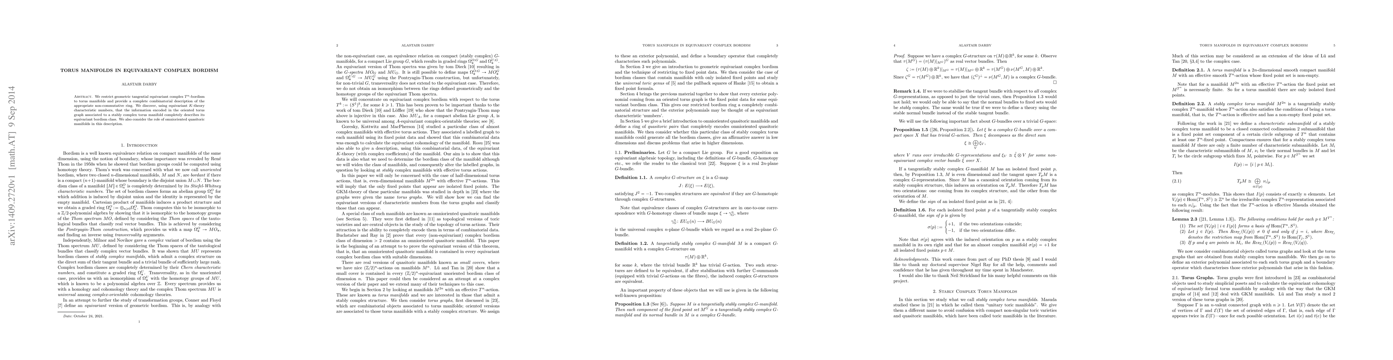 This paper provides a detailed combinatorial description of equivariant complex bordism for torus manifolds, showing that the oriented torus graph captures all necessary equivariant bordism class information. It also explores the connection between omnioriented quasitoric manifolds and this equivariant $K$-theory framework.