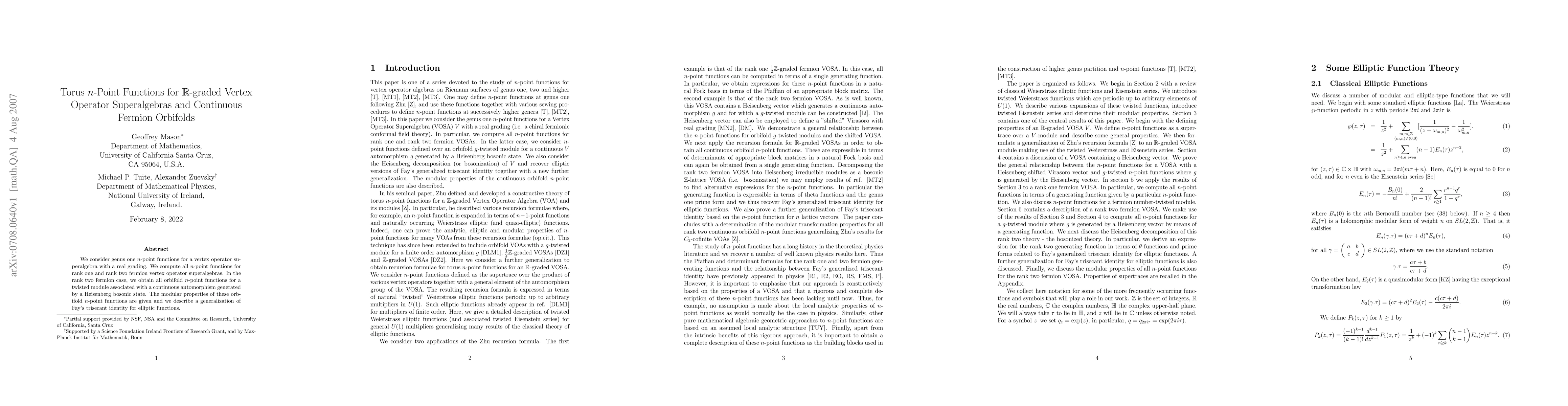 This paper calculates n-point functions for vertex operator superalgebras with real grading, generalizing a known identity in elliptic functions, and applies these results to orbifolds of continuous fermion vertex operators.