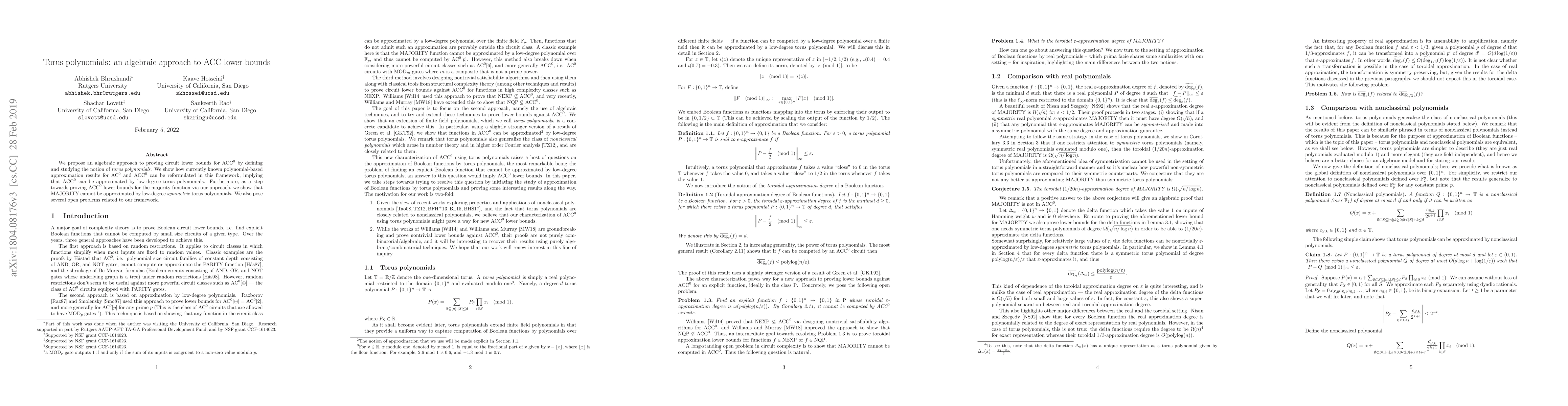 This paper introduces torus polynomials as an algebraic method to explore circuit lower bounds for ACC0 circuits. It demonstrates that ACC0 functions can be approximated by low-degree torus polynomials, while showing that the majority function cannot be approximated by low-degree symmetric torus polynomials, hinting at potential ACC0 lower bounds.