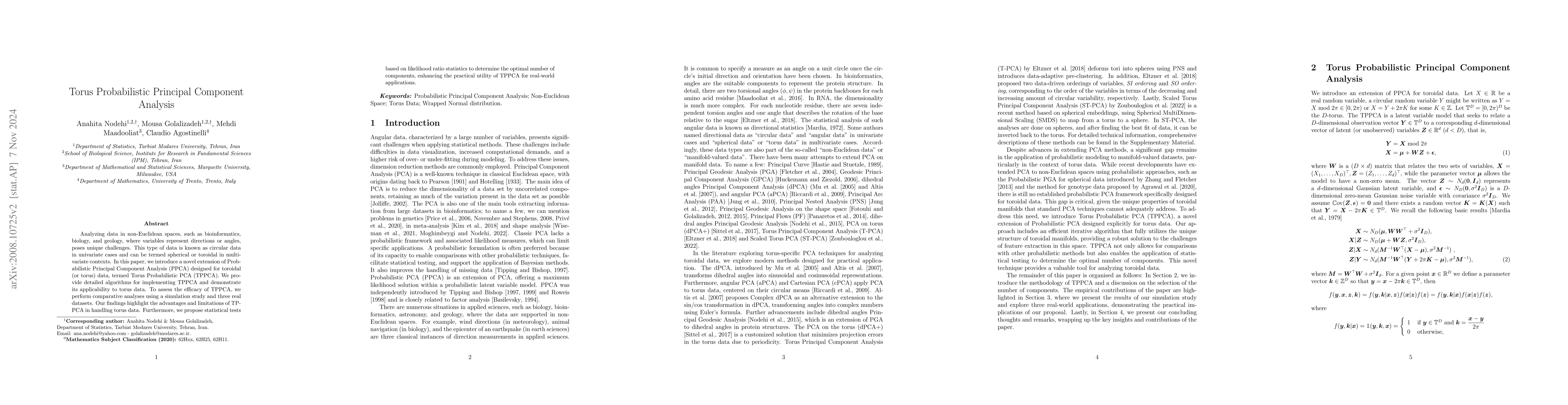 This paper introduces a Probabilistic PCA for data on torus (TPPCA), utilizing a Multivariate Wrapped Normal distribution, and proposes algorithms for its computation. It compares TPPCA with other dimension reduction techniques using real datasets and a Monte Carlo simulation.