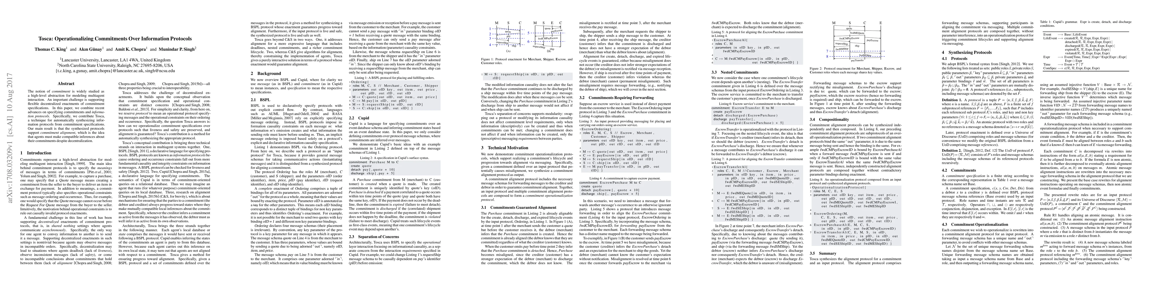 Tosca presents a technique for automatically synthesizing information protocols from commitment specifications to support flexible decentralized enactments. The synthesized protocols enable commitment alignment, ensuring that agents make compatible inferences about their commitments despite decentralization.