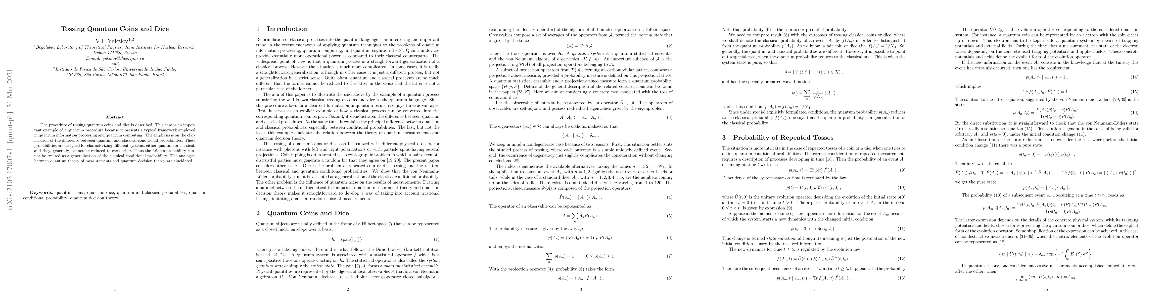 This paper explains the process of tossing quantum coins and dice, highlighting key differences between quantum and classical probabilities, and drawing parallels with measurement theory in quantum computing.