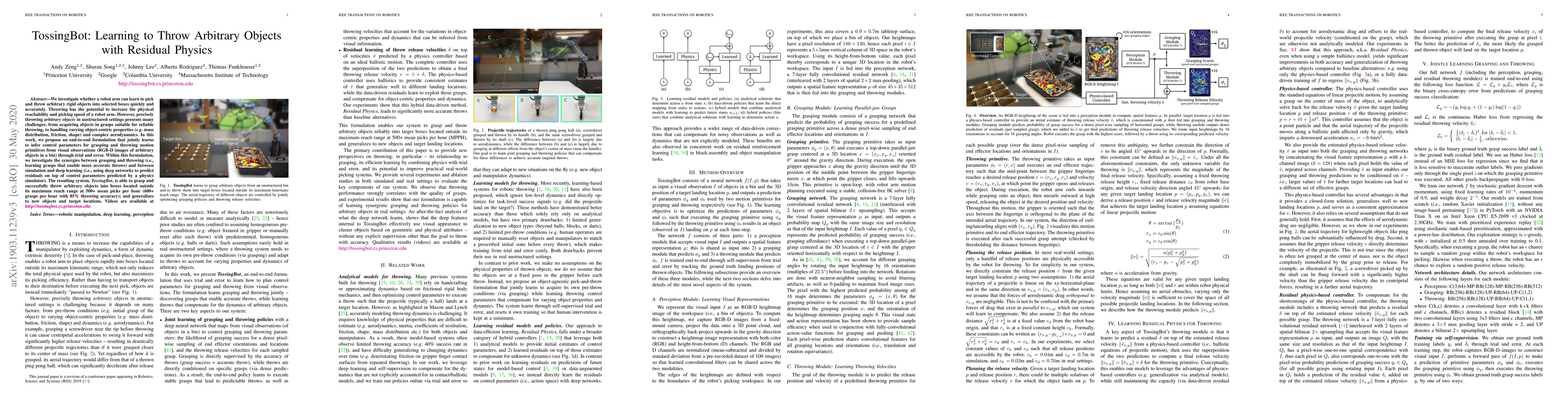 We investigate whether a robot arm can learn to pick and throw arbitrary objects into selected boxes quickly and accurately. Throwing has the potential to increase the physical reachability and picking speed of a robot arm. However, precisely throwing arbitrary objects in unstructured settings presents many challenges: from acquiring reliable pre-throw conditions (e.g. initial pose of object in manipulator) to handling varying object-centric properties (e.g. mass distribution, friction, shape) and dynamics (e.g. aerodynamics). In this work, we propose an end-to-end formulation that jointly learns to infer control parameters for grasping and throwing motion primitives from visual observations (images of arbitrary objects in a bin) through trial and error. Within this formulation, we investigate the synergies between grasping and throwing (i.e., learning grasps that enable more accurate throws) and between simulation and deep learning (i.e., using deep networks to predict residuals on top of control parameters predicted by a physics simulator). The resulting system, TossingBot, is able to grasp and throw arbitrary objects into boxes located outside its maximum reach range at 500+ mean picks per hour (600+ grasps per hour with 85% throwing accuracy); and generalizes to new objects and target locations. Videos are available at https://tossingbot.cs.princeton.edu