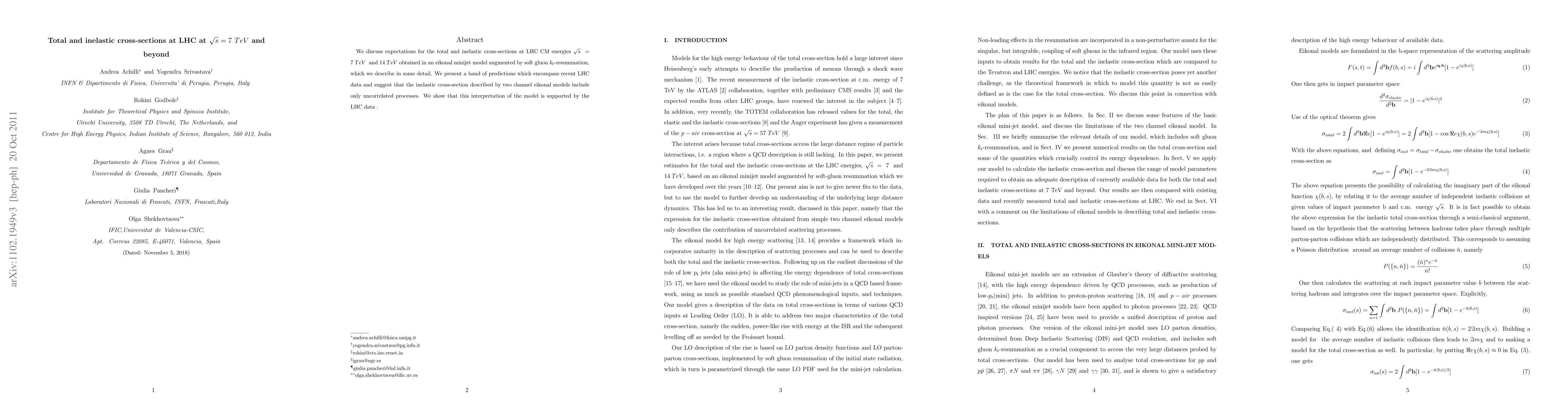 We discuss expectations for the total and inelastic cross-sections at LHC CM energies $\sqrt{s}\ =\ 7\ TeV$ {and $ 14\ TeV$} obtained in an eikonal minijet model augmented by soft gluon $k_t$-resummation, which we describe in some detail. We present a band of predictions which encompass recent LHC data and suggest that the inelastic cross-section described by two channel eikonal models include only uncorrelated processes. We show that this interpretation of the model is supported by the LHC data.