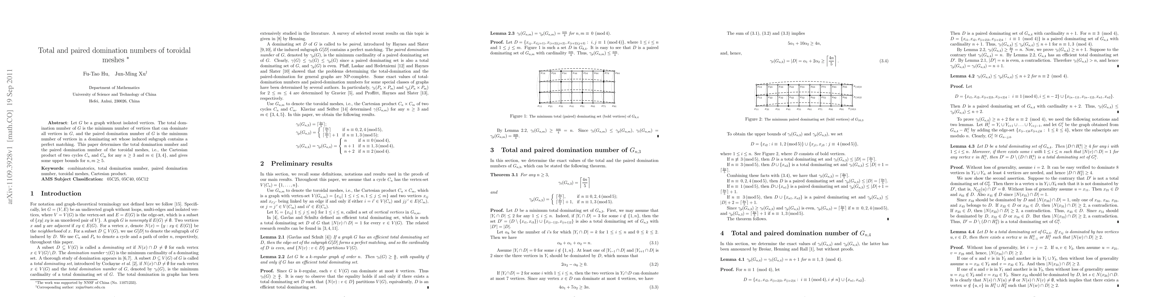 Let $G$ be a graph without isolated vertices. The total domination number of $G$ is the minimum number of vertices that can dominate all vertices in $G$, and the paired domination number of $G$ is the minimum number of vertices in a dominating set whose induced subgraph contains a perfect matching. This paper determines the total domination number and the paired domination number of the toroidal meshes, i.e., the Cartesian product of two cycles $C_n$ and $C_m$ for any $n\ge 3$ and $m\in\{3,4\}$, and gives some upper bounds for $n, m\ge 5$.