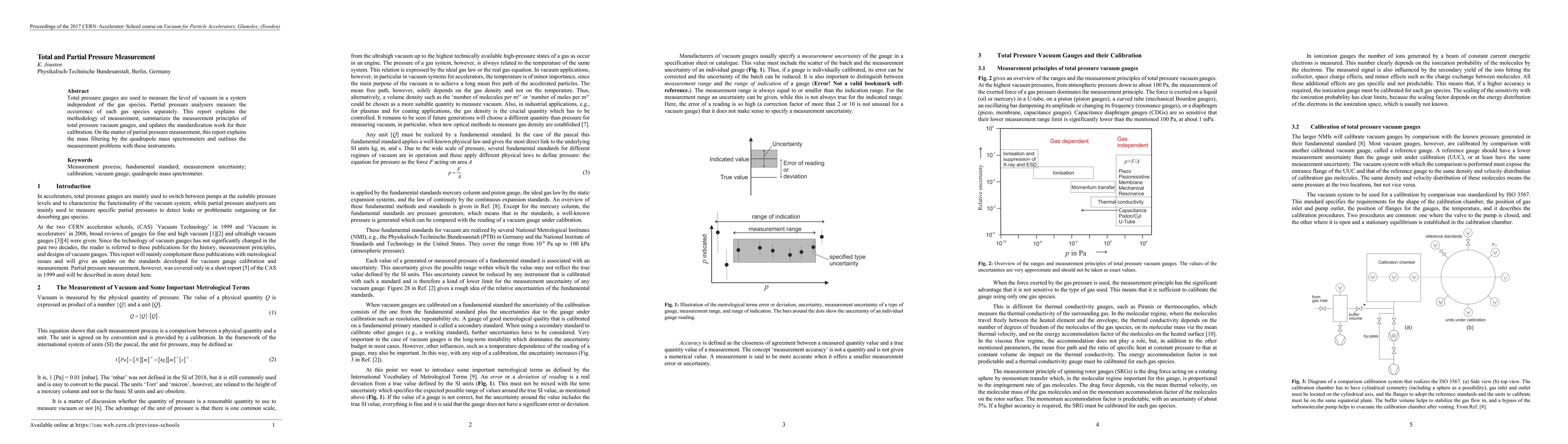 This paper discusses the methodologies for measuring total and partial pressures in a system, detailing the principles of total pressure vacuum gauges and the calibration standards, while also addressing the use of quadrupole mass spectrometers for partial pressure measurement and associated challenges.
