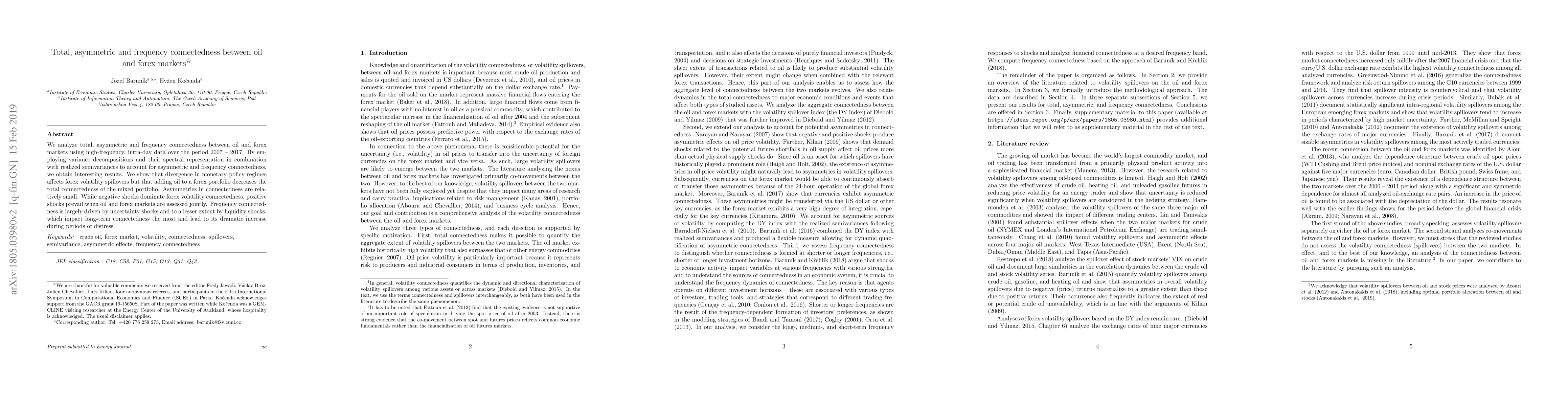 This study investigates total, asymmetric, and frequency connectedness between oil and forex markets using high-frequency intra-day data from 2007 to 2017. It finds that while divergence in monetary policy affects forex volatility spillovers, oil inclusion in forex portfolios reduces overall connectedness. Asymmetries show negative shocks dominate forex volatility, but positive shocks prevail in joint assessments, with frequency connectedness mainly driven by uncertainty shocks.
