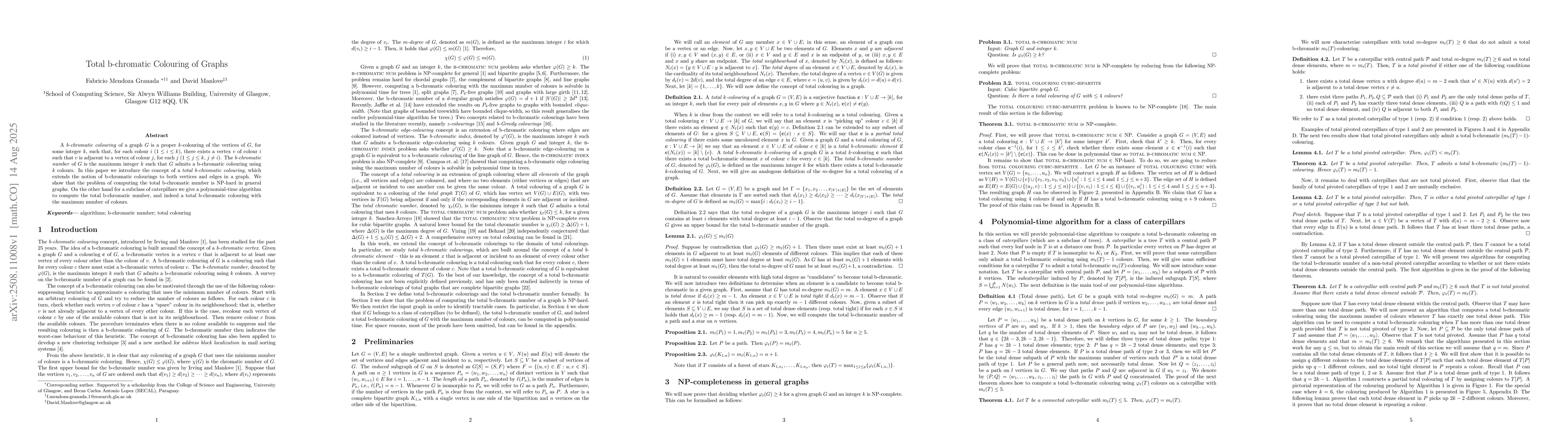 A b-chromatic colouring of a graph $G$ is a proper $k$-colouring of the vertices of $G$, for some integer $k$, such that, for each colour $i$ ($1\leq i\leq k$), there exists a vertex $v$ of colour $i$ such that $v$ is adjacent to a vertex of colour $j$, for each $j$ ($1\leq j\leq k$, $j\neq i$). The b-chromatic number of $G$ is the maximum integer $k$ such that $G$ admits a b-chromatic colouring using $k$ colours. In this paper we introduce the concept of a total b-chromatic colouring, which extends the notion of b-chromatic colourings to both vertices and edges in a graph. We show that the problem of computing the total b-chromatic number is NP-hard in general graphs. On the other hand for a subclass of caterpillars we give a polynomial-time algorithm to compute the total b-chromatic number, and indeed a total b-chromatic colouring with the maximum number of colours.