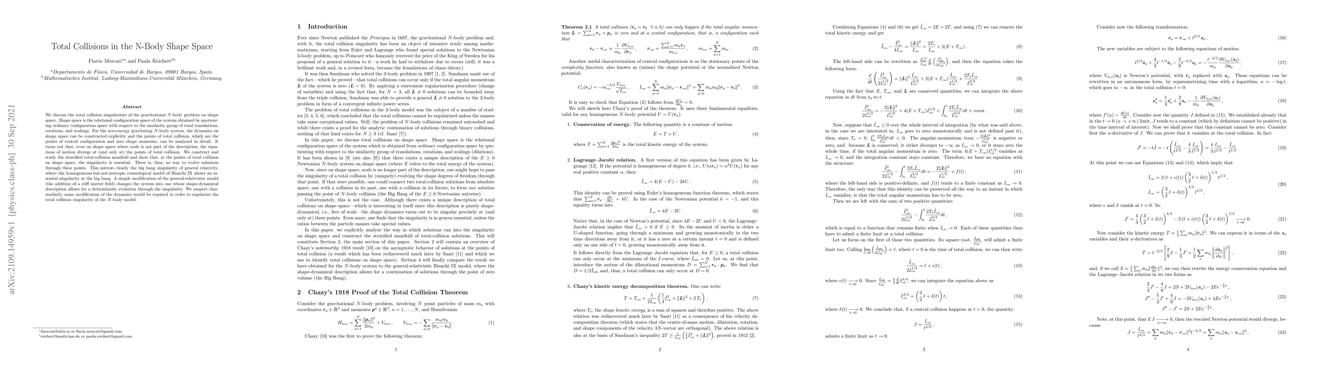 We discuss the total collision singularities of the gravitational N-body problem on shape space. Shape space is the relational configuration space of the system obtained by quotienting ordinary configuration space with respect to the similarity group of total translations, rotations, and scalings. For the zero-energy gravitating N-body system, the dynamics on shape space can be constructed explicitly and the points of total collision, which are the points of central configuration and zero shape momenta, can be analyzed in detail. It turns out that, even on shape space where scale is not part of the description, the equations of motion diverge at (and only at) the points of total collision. We construct and study the stratified total-collision manifold and show that, at the points of total collision on shape space, the singularity is essential. There is, thus, no way to evolve the solutions through these points. This mirrors closely the big bang singularity of general relativity, where the homogeneous-but-not-isotropic cosmological model of Bianchi IX shows an essential singularity at the big bang. A simple modification of the general-relativistic model (the addition of a stiff matter field) changes the system into one whose shape-dynamical description allows for a deterministic evolution through the singularity. We suspect that, similarly, some modification of the dynamics would be required in order to regularize the total collision singularity of the N-body model.
