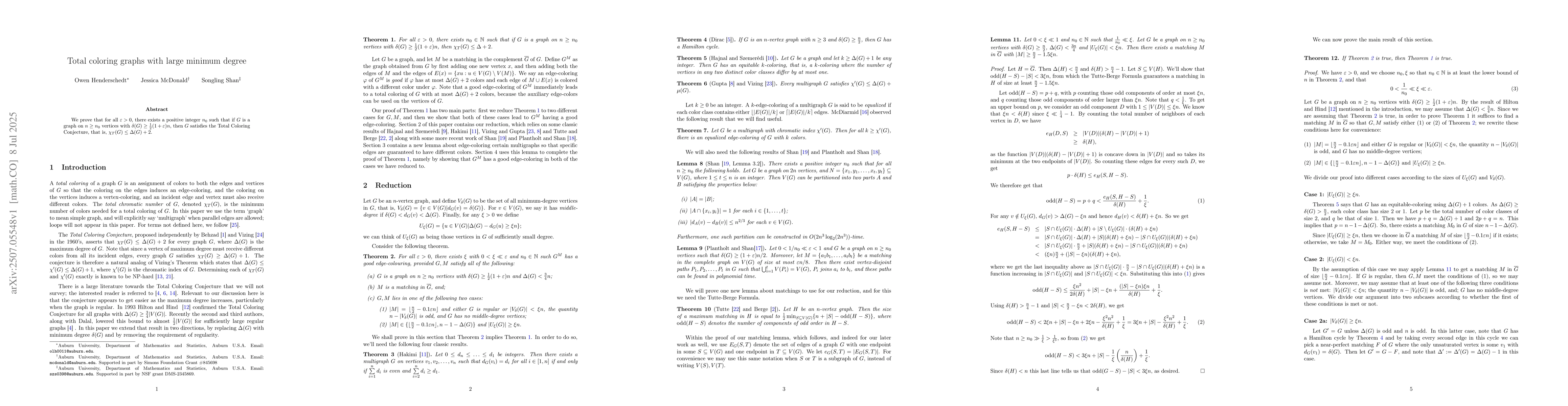 We prove that for all $\varepsilon>0$, there exists a positive integer $n_0$ such that if $G$ is a graph on $n\geq n_0$ vertices with $\delta(G)\geq\tfrac{1}{2}(1 + \varepsilon)n$, then $G$ satisfies the Total Coloring Conjecture, that is, $\chi_T(G)\leq \Delta(G)+2$.