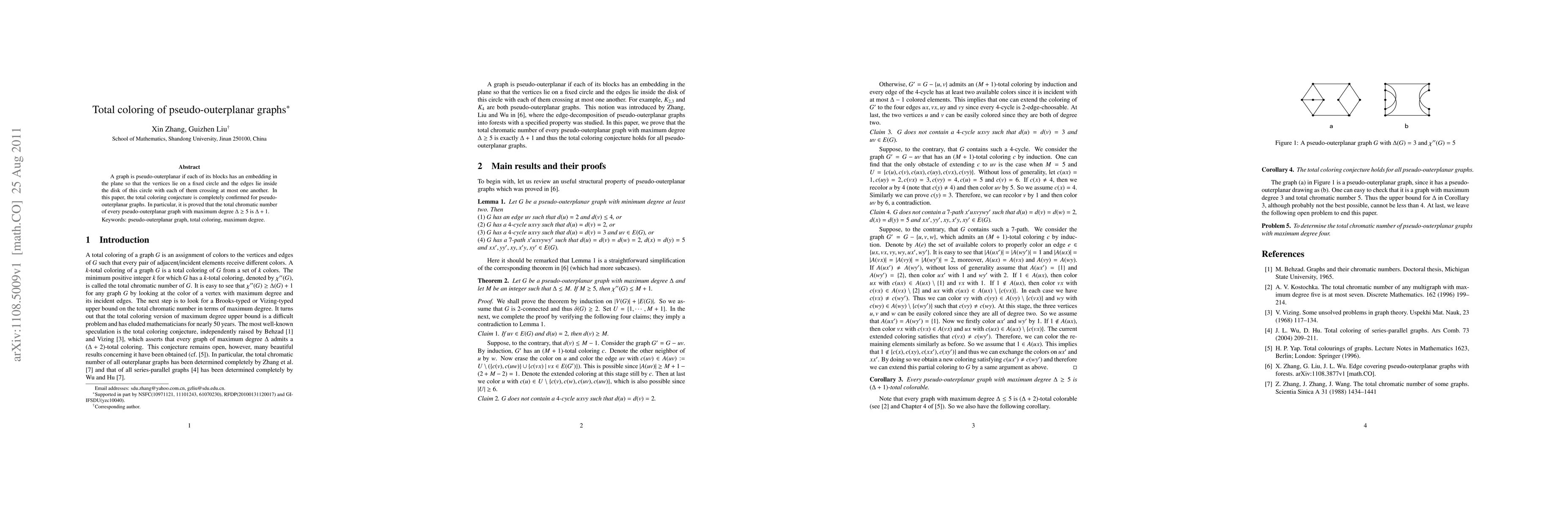 This paper confirms the total coloring conjecture for pseudo-outerplanar graphs, proving that the total chromatic number for such graphs with a maximum degree of $\Delta \geq 5$ is $\Delta + 1$. This resolves the conjecture for this class of graphs.