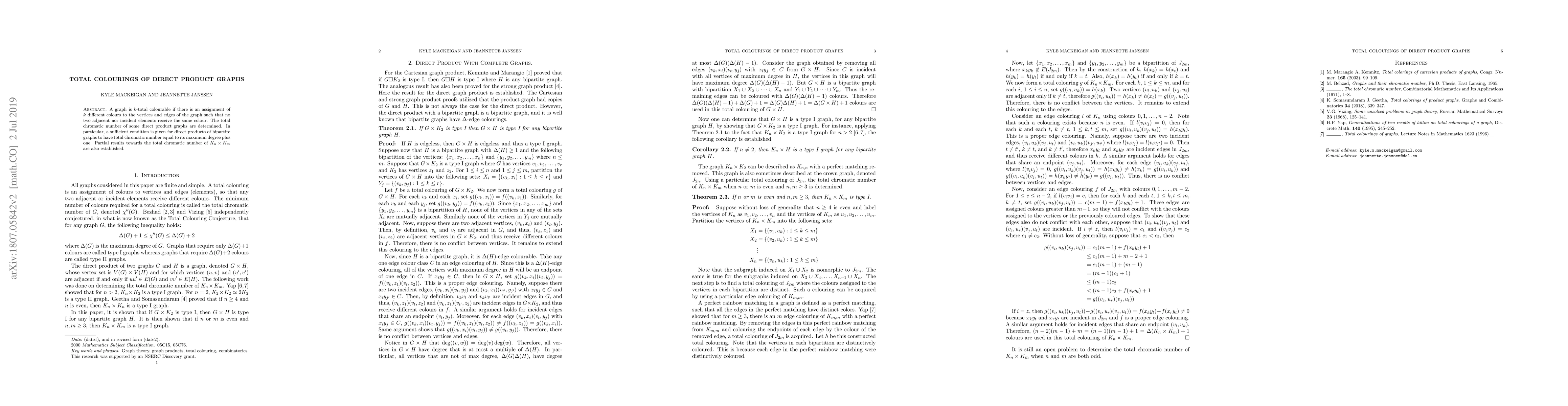 A graph is k-total colourable if there is an assignment of k different colours to the vertices and edges of the graph such that no two adjacent nor incident elements receive the same colour. The total chromatic number of some direct product graphs are determined. In particular, a sufficient condition is given for direct products of bipartite graphs to have total chromatic number equal to its maximum degree plus one. Partial results towards the total chromatic number of the direct product of complete graphs are also established.