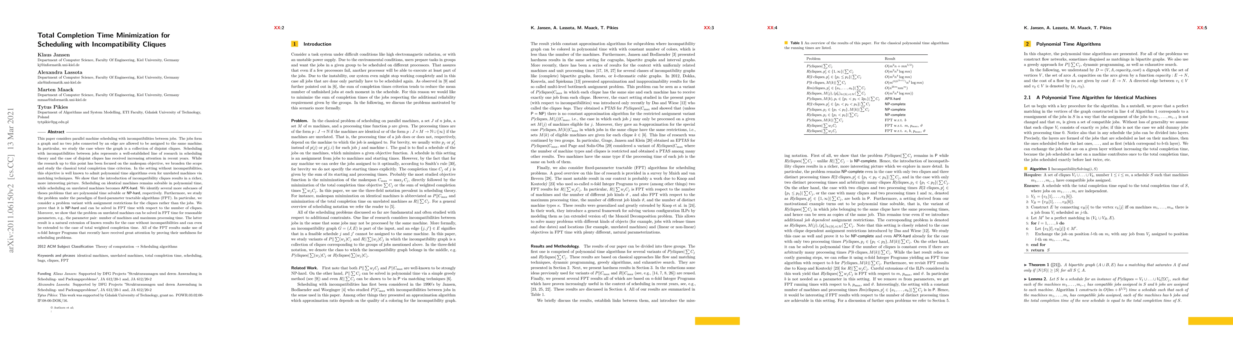 This paper studies parallel machine scheduling with incompatibilities represented by cliques, focusing on minimizing total completion time. It finds that scheduling on identical machines remains polynomial-time solvable, while on unrelated machines it becomes APX-hard. The study also introduces fixed-parameter tractability for the problem, showing efficient solutions under certain parameters.