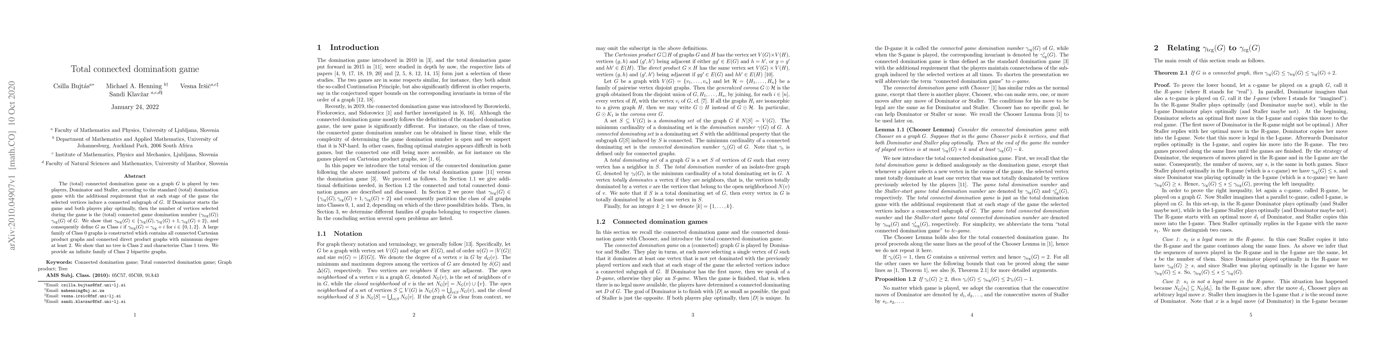 The paper studies the (total) connected domination game on graphs, where players select vertices to form connected subgraphs while aiming to dominate the graph. It establishes that the total connected game domination number $\gamma_{\rm tcg}(G)$ is either $\gamma_{\rm cg}(G)$, $\gamma_{\rm cg}(G) + 1$, or $\gamma_{\rm cg}(G) + 2$, classifying graphs into three classes based on this relationship.