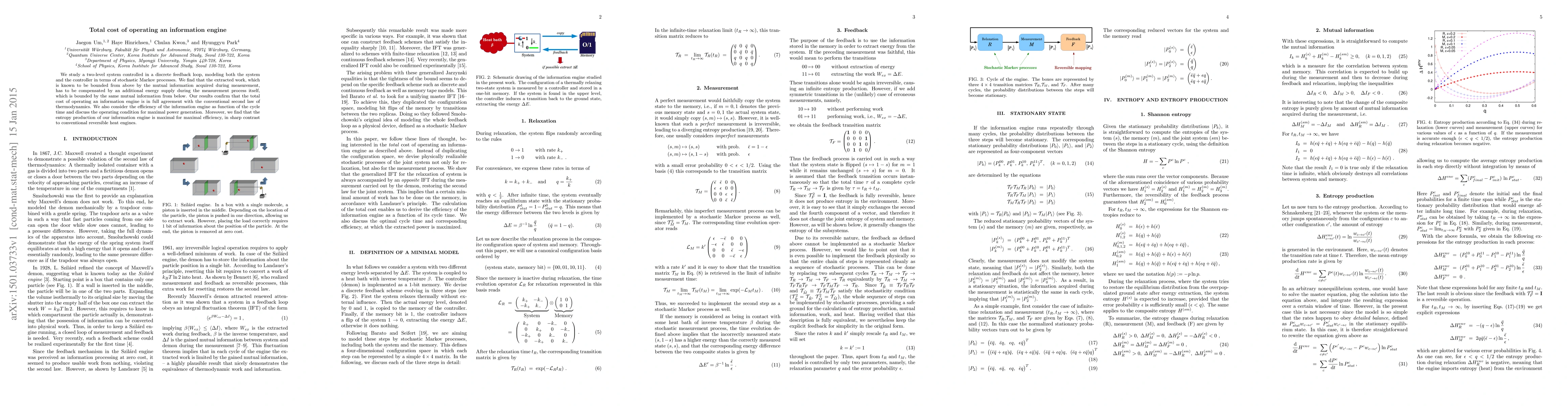 This paper models a two-level system and its controller as stochastic Markov processes, demonstrating that the total operating cost of an information engine is governed by the second law of thermodynamics. It finds that maximal efficiency occurs at maximal entropy production, contrasting with conventional reversible heat engines.