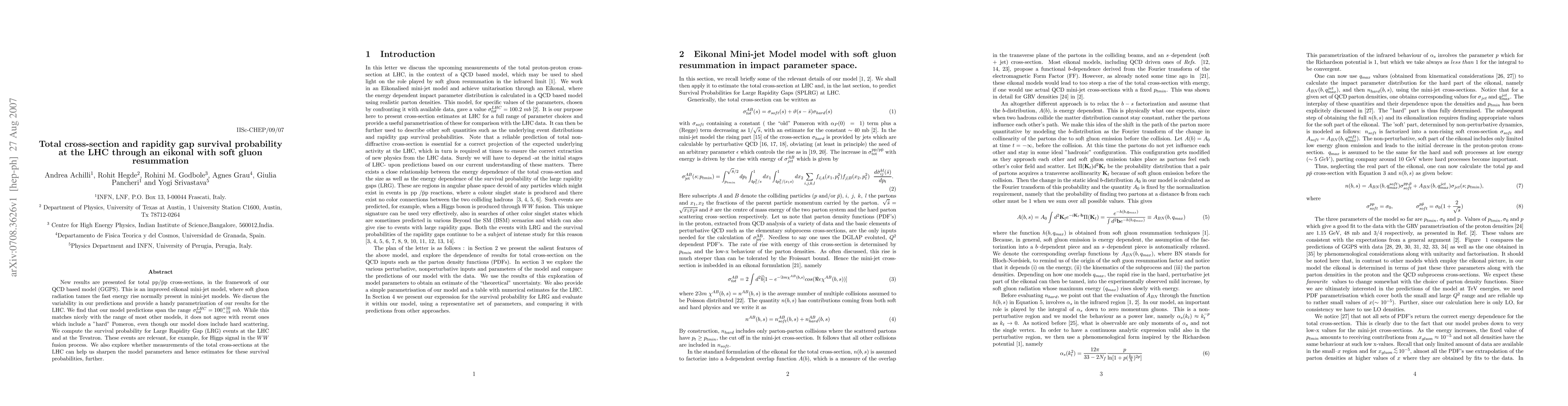 New results are presented for total ${\rm pp}/ {\rm \bar p p}$ cross-sections, in the framework of our QCD based model (GGPS). This is an improved eikonal mini-jet model, where soft gluon radiation tames the fast energy rise normally present in mini-jet models. We discuss the variability in our predictions and provide a handy parametrization of our results for the LHC. We find that our model predictions span the range $\sigma_{tot}^{LHC}=100 ^{+10}_{-13} mb$. While this matches nicely with the range of most other models, it does not agree with recent ones which include a "hard" Pomeron, even though our model does include hard scattering. We compute the survival probability for Large Rapidity Gap (LRG) events at the LHC and at the Tevatron. These events are relevant, for example, for Higgs signal in the $WW$ fusion process. We also explore whether measurements of the total cross-sections at the LHC can help us sharpen the model parameters and hence estimates for these survival probabilities, further.