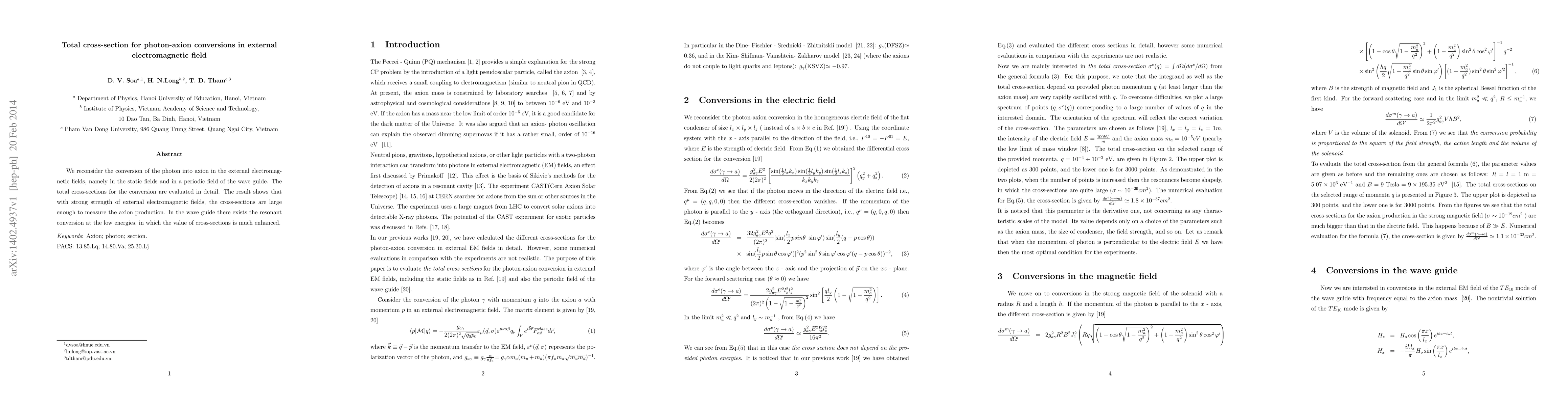 This paper evaluates the total cross-section for photon-to-axion conversions in external electromagnetic fields, finding that strong fields can significantly enhance these conversions. It also identifies resonant conversion in waveguides at low energies, leading to much larger cross-section values.
