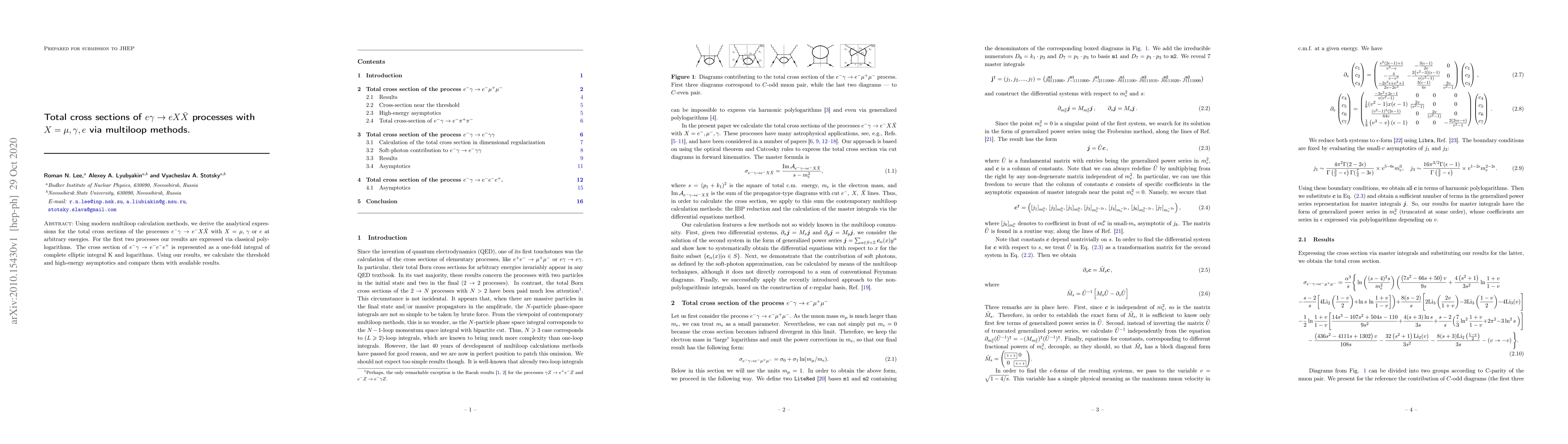 This paper derives analytical expressions for the total cross sections of $e\gamma \to eX\bar{X}$ processes using multiloop methods, with $X$ being $\mu, \gamma$, or $e$. The results include classical polylogarithms for the first two processes and a combination of elliptic integrals and logarithms for the third.