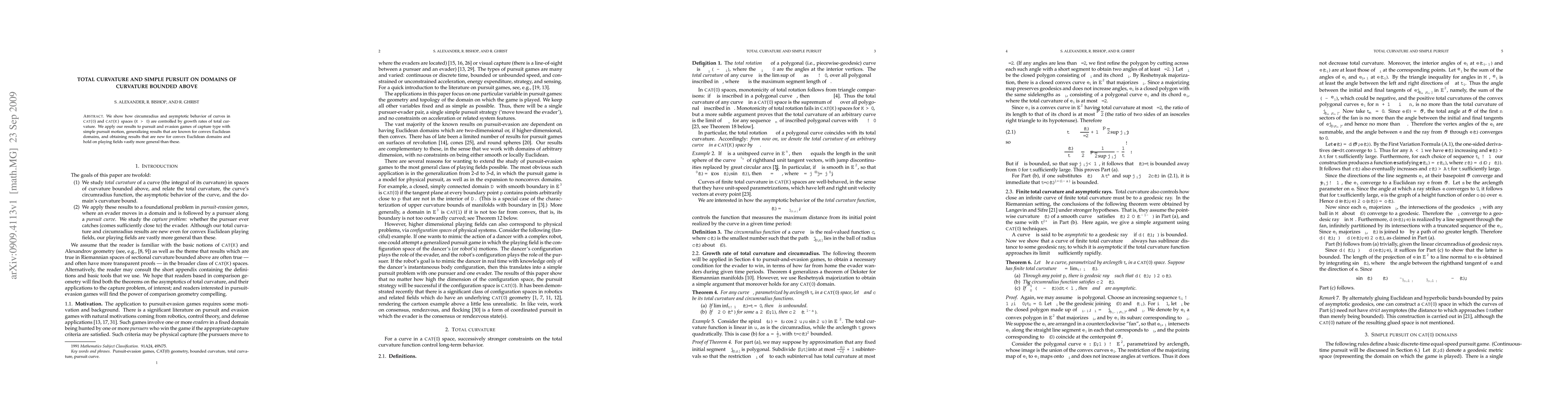 We show how circumradius and asymptotic behavior of curves in CAT(0) and CAT(K) spaces(K>0) are controlled by growth rates of total curvature. We apply our results to pursuit and evasion games of capture type with simple pursuit motion, generalizing results that are known for convex Euclidean domains, and obtaining results that are new for convex Euclidean domains and hold on playing fields vastly more general than these.