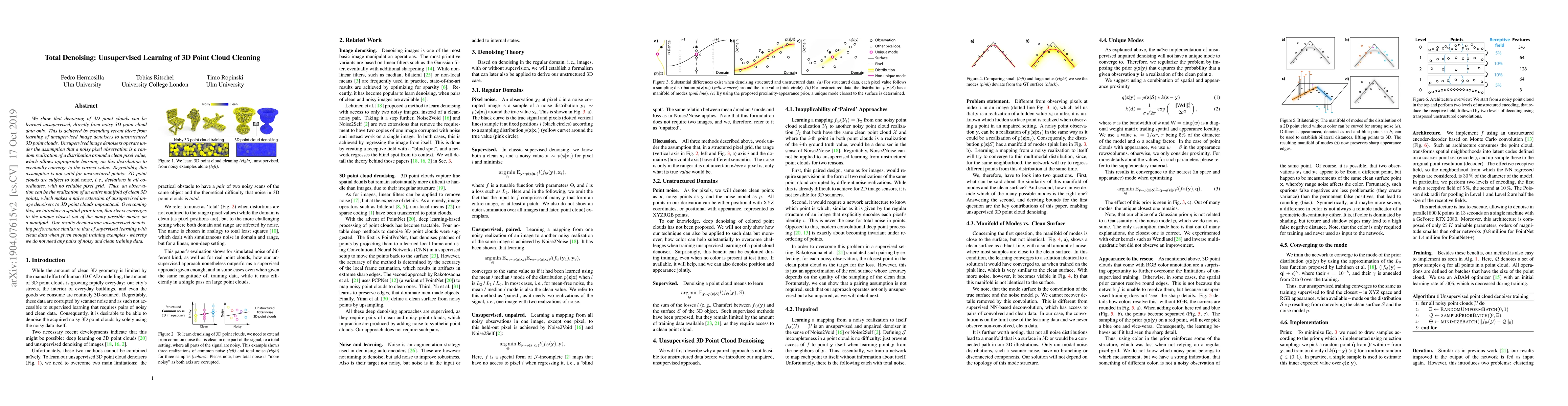 This paper presents an unsupervised learning method for denoising 3D point clouds by extending ideas from unsupervised image denoisers, introducing a spatial prior term to handle the total noise in 3D point clouds and achieve performance comparable to supervised methods without requiring clean data pairs.