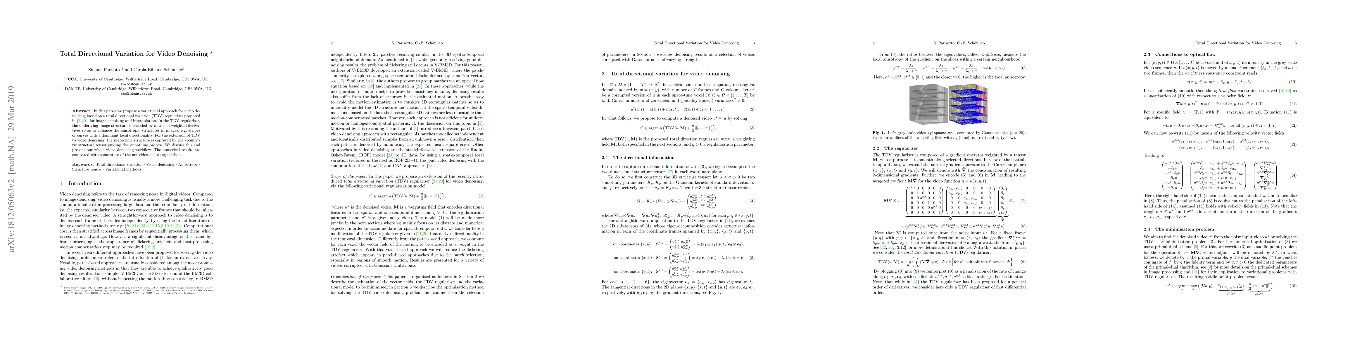 This paper introduces a variational approach for video denoising using a total directional variation (TDV) regulariser, extending the method from image denoising to capture space-time structure. The proposed method outperforms state-of-the-art video denoising techniques in numerical comparisons.