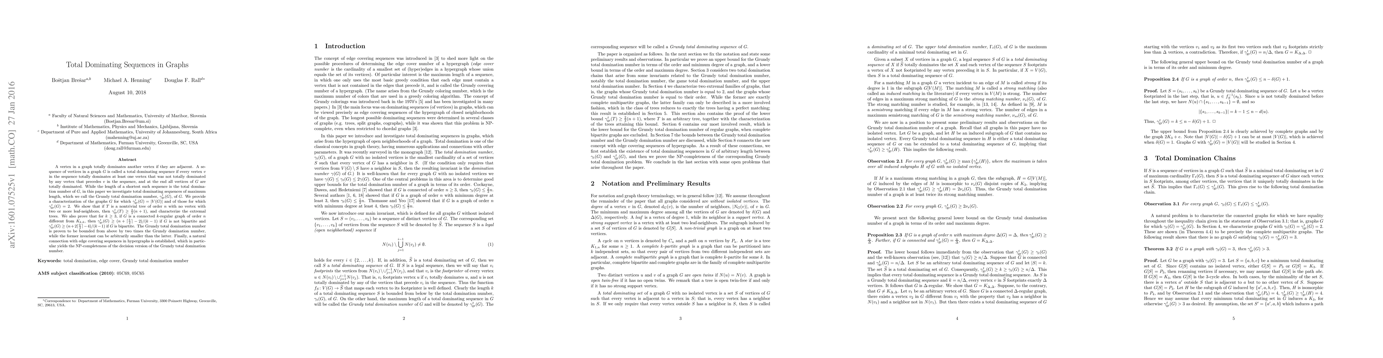The paper investigates total dominating sequences in graphs, defining the Grundy total domination number ($\gamma_{\rm gr}^t(G)$) as the length of the longest total dominating sequence, characterizing graphs with this number equal to the total number of vertices and those with it equal to 2.