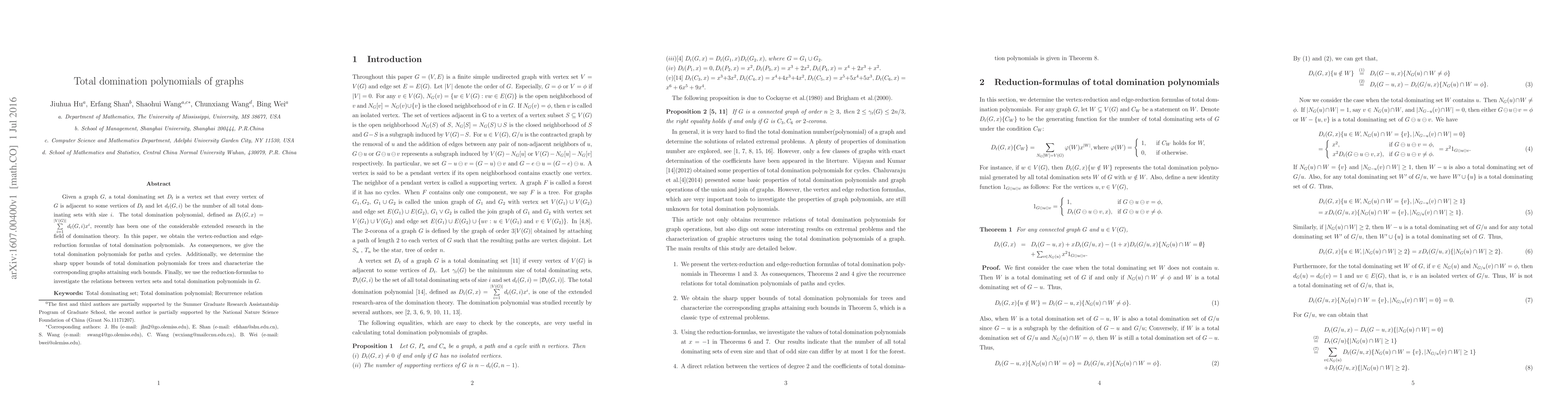This paper explores total domination polynomials in graphs, deriving vertex-reduction and edge-reduction formulas. It provides the total domination polynomials for paths and cycles, determines upper bounds for trees, and characterizes extremal graphs, ultimately analyzing the connections between vertex sets and total domination polynomials.