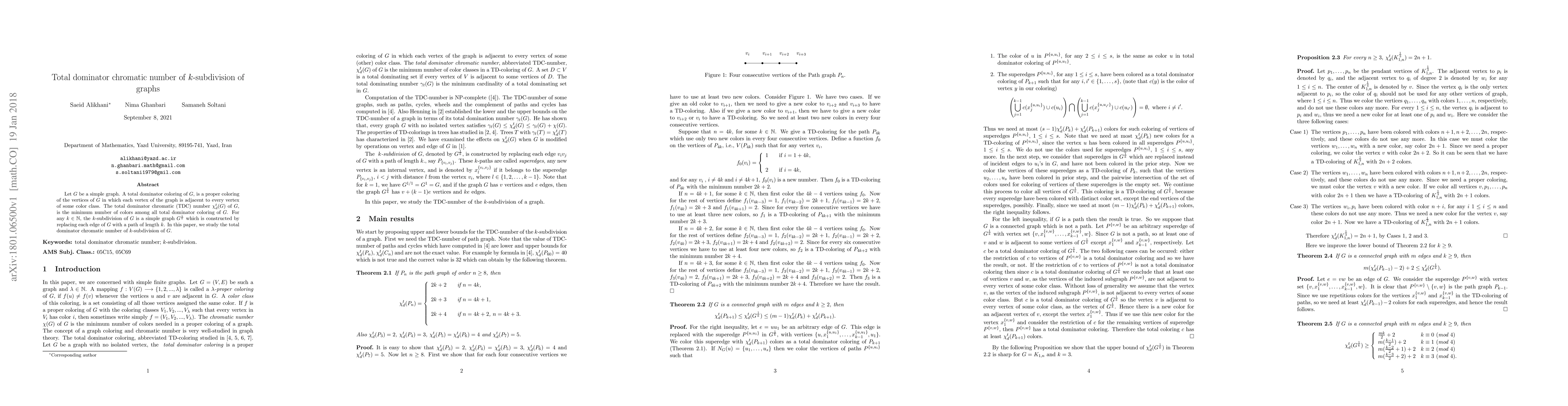 This paper investigates the total dominator chromatic number ($\chi_d^t$) of graphs after $k$-subdivision, where each edge is replaced by a path of length $k$. It explores the minimum number of colors needed for a total dominator coloring of these modified graphs.
