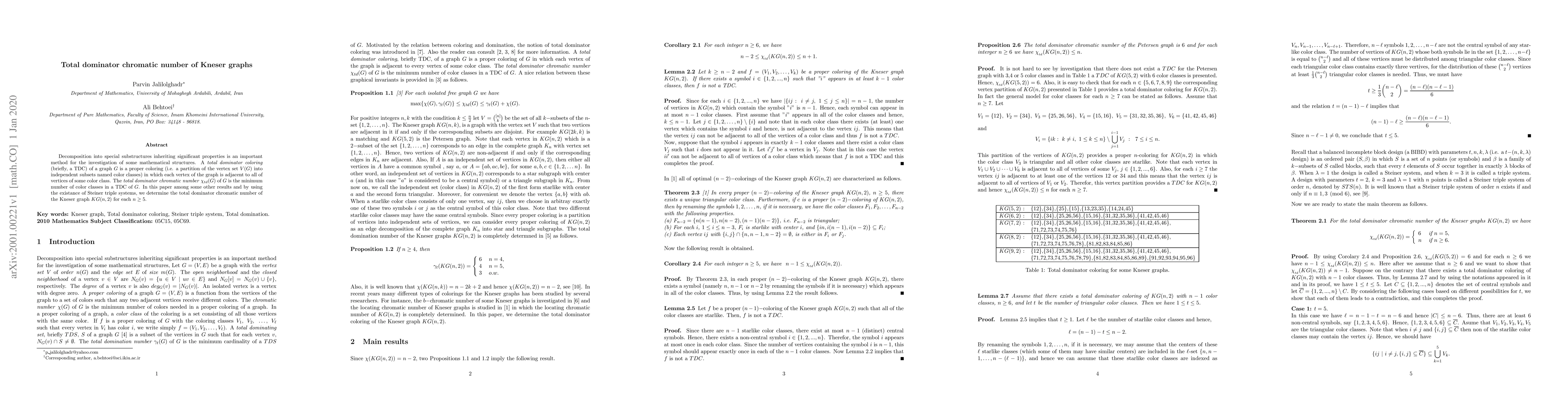 In this paper among some other results and by using the existance of Steiner triple systems, we determine the total dominator chromatic number of the Kneser graph KG(n,2).