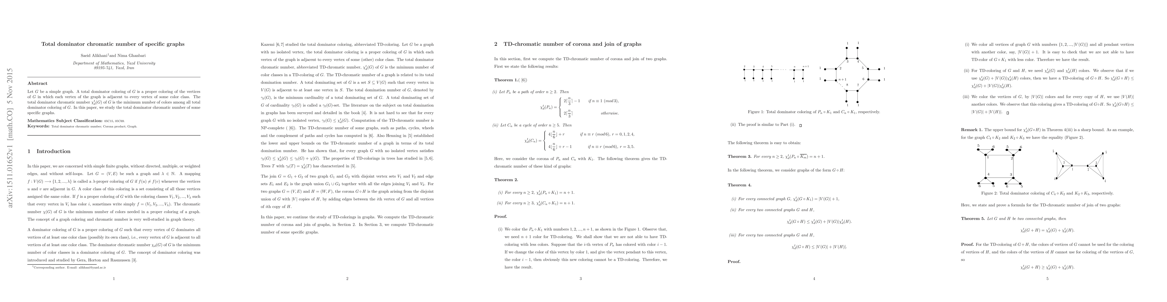 This paper investigates the total dominator chromatic number $\chi_d^t(G)$ of specific graphs, where each vertex must be adjacent to vertices of every color class in a proper total dominator coloring. The focus is on determining the minimum number of colors required for these specific graph structures.