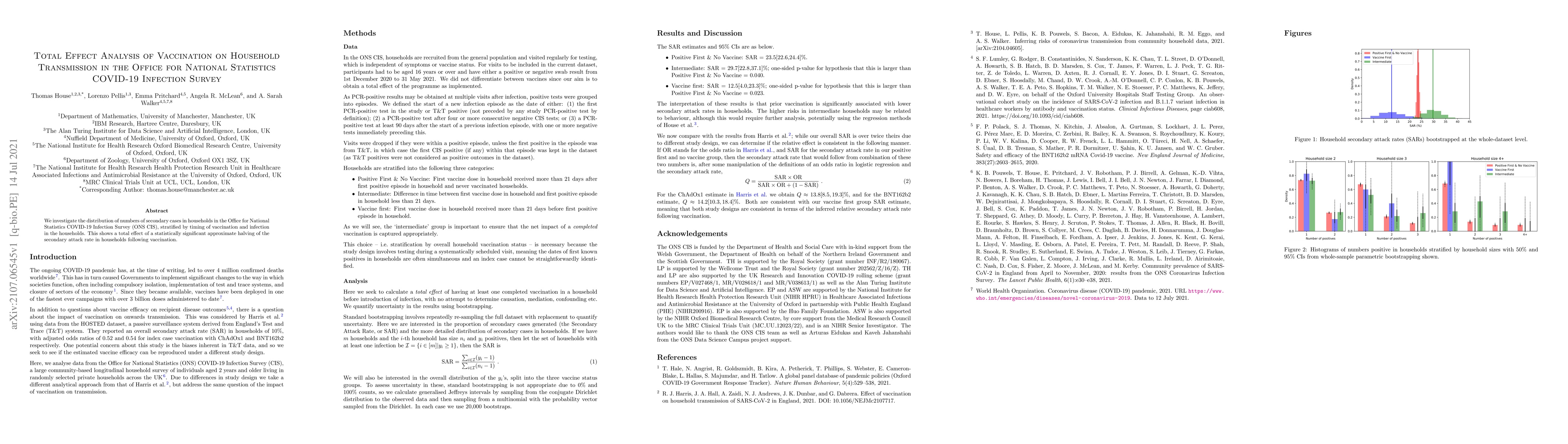Summary: This study analyzes the Office for National Statistics COVID-19 Infection Survey to determine the impact of vaccination on household transmission, finding a statistically significant reduction in secondary cases, approximately halving the secondary attack rate post-vaccination.