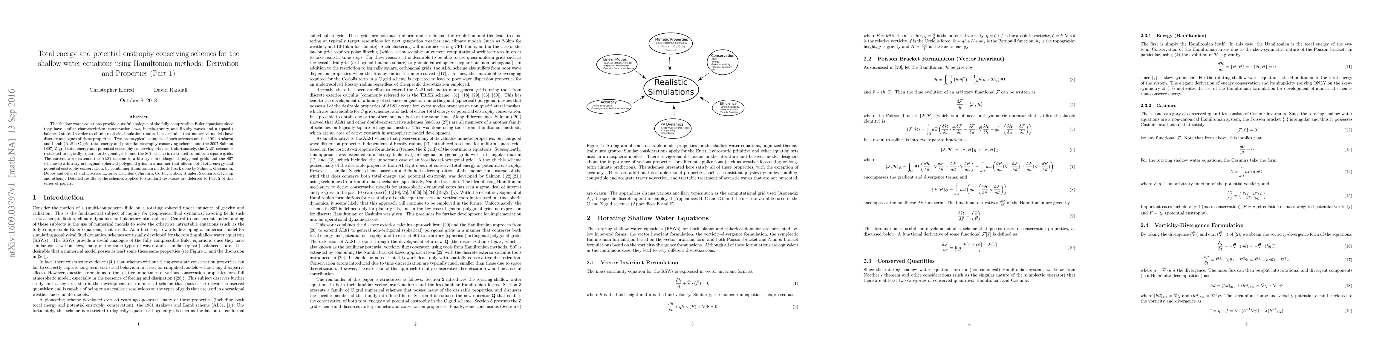 The shallow water equations provide a useful analogue of the fully compressible Euler equations since they have similar characteristics: conservation laws, inertia-gravity and Rossby waves and a (quasi-) balanced state. In order to obtain realistic simulation results, it is desirable that numerical models have discrete analogues of these properties. Two prototypical examples of such schemes are the 1981 Arakawa and Lamb (AL81) C-grid total energy and potential enstrophy conserving scheme, and the 2007 Salmon (S07) Z-grid total energy and potential enstrophy conserving scheme. Unfortunately, the AL81 scheme is restricted to logically square, orthogonal grids; and the S07 scheme is restricted to uniform square grids. The current work extends the AL81 scheme to arbitrary non-orthogonal polygonal grids and the S07 scheme to arbitrary orthogonal spherical polygonal grids in a manner that allows both total energy and potential enstrophy conservation, by combining Hamiltonian methods (work done by Salmon, Gassmann, Dubos and others) and Discrete Exterior Calculus (Thuburn, Cotter, Dubos, Ringler, Skamarock, Klemp and others). Detailed results of the schemes applied to standard test cases are deferred to Part 2 of this series of papers.