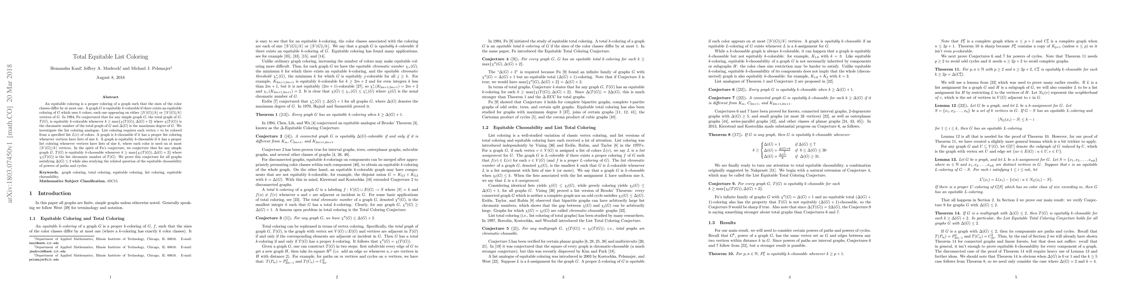 This paper explores the equitable list coloring of total graphs, proving a conjecture that for any simple graph $G$, the total graph $T(G)$ is equitably $k$-choosable when $k \geq \max\{\chi_l(T(G)), \Delta(G)+2\}$, and establishes this for graphs with maximum degree $\Delta(G) \leq 2$. It also investigates the equitable choosability of powers of paths and cycles.