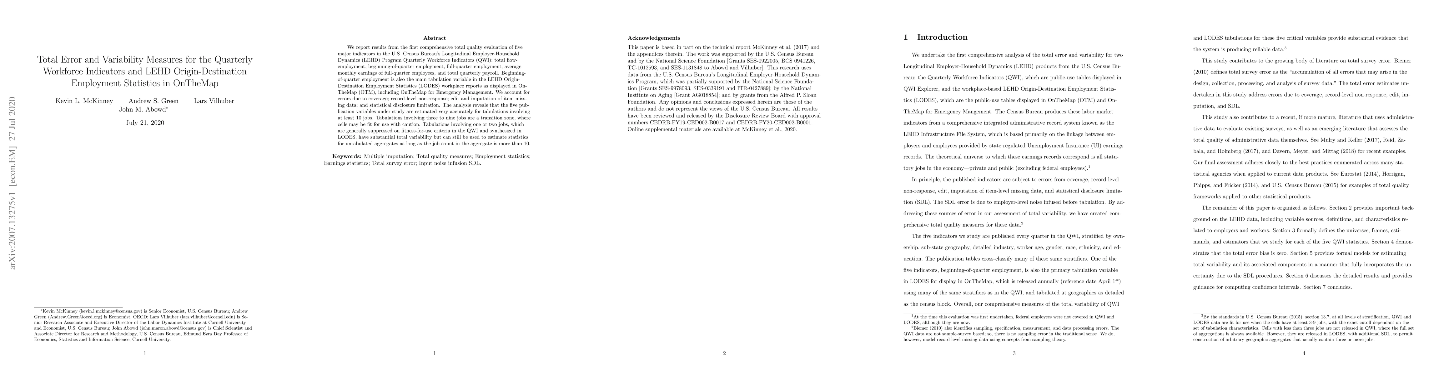 We report results from the first comprehensive total quality evaluation of five major indicators in the U.S. Census Bureau's Longitudinal Employer-Household Dynamics (LEHD) Program Quarterly Workforce Indicators (QWI): total flow-employment, beginning-of-quarter employment, full-quarter employment, average monthly earnings of full-quarter employees, and total quarterly payroll. Beginning-of-quarter employment is also the main tabulation variable in the LEHD Origin-Destination Employment Statistics (LODES) workplace reports as displayed in OnTheMap (OTM), including OnTheMap for Emergency Management. We account for errors due to coverage; record-level non-response; edit and imputation of item missing data; and statistical disclosure limitation. The analysis reveals that the five publication variables under study are estimated very accurately for tabulations involving at least 10 jobs. Tabulations involving three to nine jobs are a transition zone, where cells may be fit for use with caution. Tabulations involving one or two jobs, which are generally suppressed on fitness-for-use criteria in the QWI and synthesized in LODES, have substantial total variability but can still be used to estimate statistics for untabulated aggregates as long as the job count in the aggregate is more than 10.