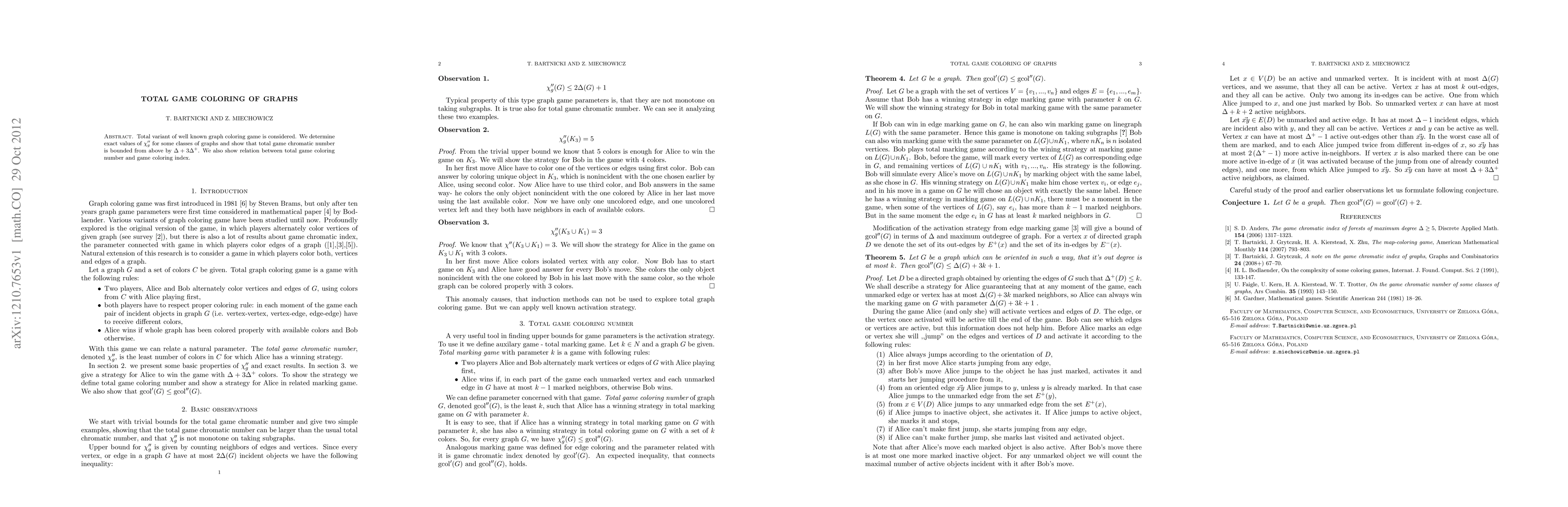 This work extends previous research on graph coloring games by focusing on the total variant, providing new exact values for χ′′g, and demonstrating a strategy for winning the game with a specific number of colors based on the maximum degree of the graph.