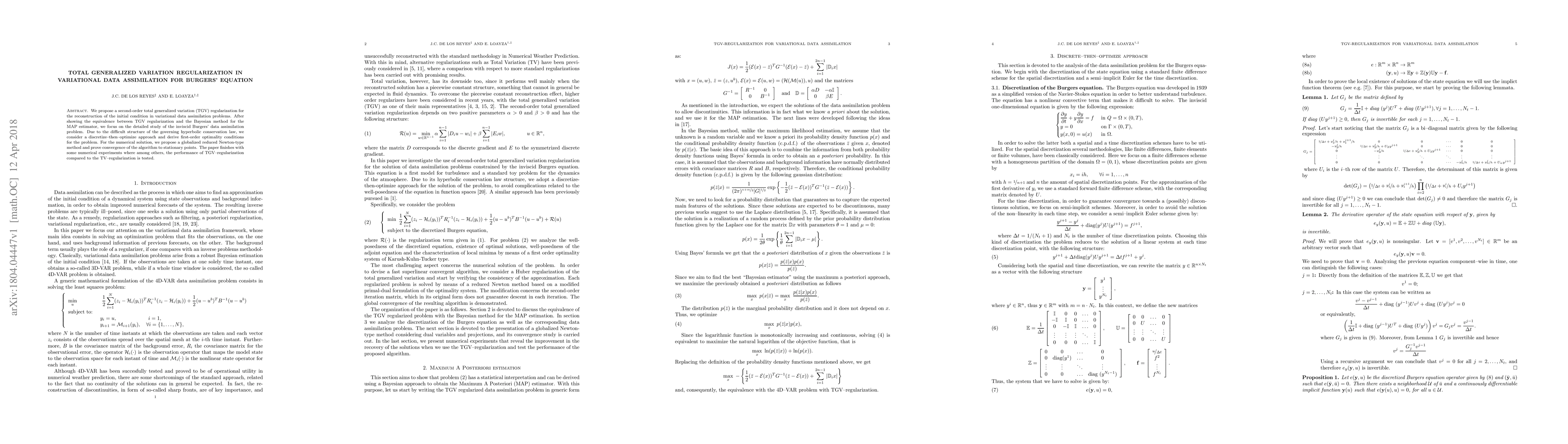 This paper introduces a second-order total generalized variation (TGV) regularization method for reconstructing initial conditions in variational data assimilation, particularly for the inviscid Burgers' equation. It demonstrates the equivalence between TGV and the Bayesian method for the MAP estimator and proposes a globalized reduced Newton-type method for numerical solution, proving its convergence. Numerical experiments compare TGV-regularization against TV-regularization.
