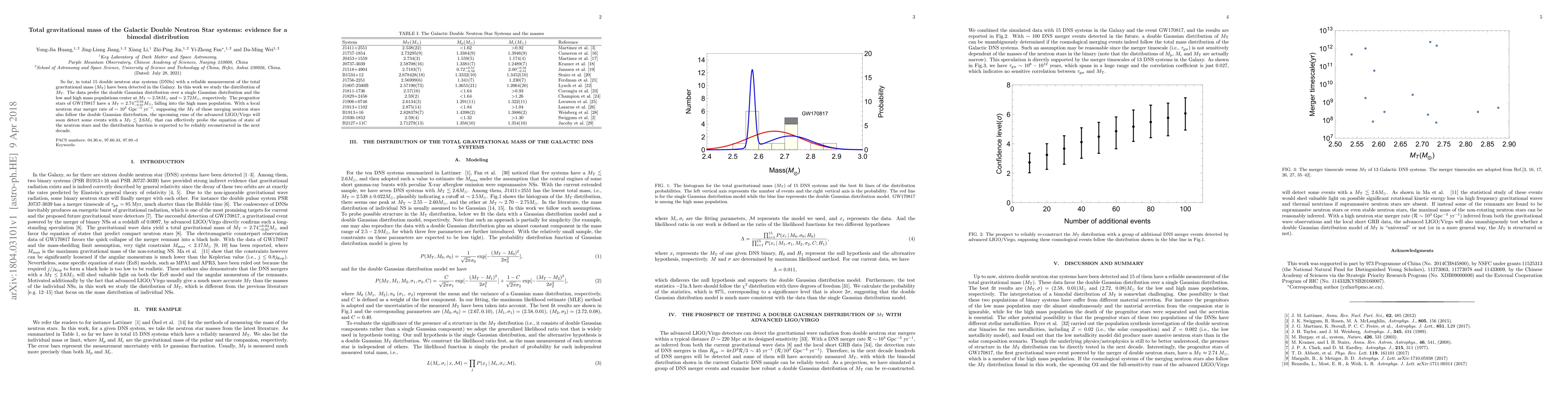 So far, in total 15 double neutron star systems (DNSs) with a reliable measurement of the total gravitational mass ($M_{\rm T}$) have been detected in the Galaxy. In this work we study the distribution of $M_{\rm T}$. The data prefer the double Gaussian distribution over a single Gaussian distribution and the low and high mass populations center at $M_{\rm T}\sim 2.58M_\odot$ and $\sim 2.72M_\odot$, respectively. The progenitor stars of GW170817 have a $M_{\rm T}=2.74^{+0.04}_{-0.01}M_\odot$, falling into the high mass population. With a local neutron star merger rate of $\sim 10^{3}~{\rm Gpc^{-3}~yr^{-1}}$, supposing the $M_{\rm T}$ of those merging neutron stars also follow the double Gaussian distribution, the upcoming runs of the advanced LIGO/Virgo will soon detect some events with a $M_{\rm T}\lesssim 2.6M_\odot$ that can effectively probe the equation of state of the neutron stars and the distribution function is expected to be reliably reconstructed in the next decade.