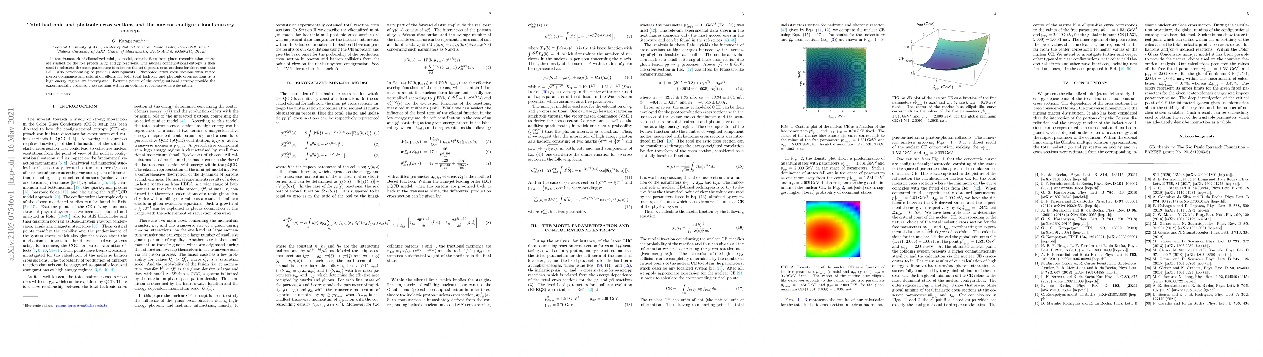 This paper investigates total hadronic and photonic cross sections using the eikonalized mini-jet model, focusing on gluon recombination effects and the nuclear configurational entropy to estimate proton cross sections in high-energy $pp$ and $\bar p p$ reactions, corroborated by LHC data. It also explores photoproduction cross sections with vector meson dominance and saturation effects, achieving optimal agreement with experimental results.