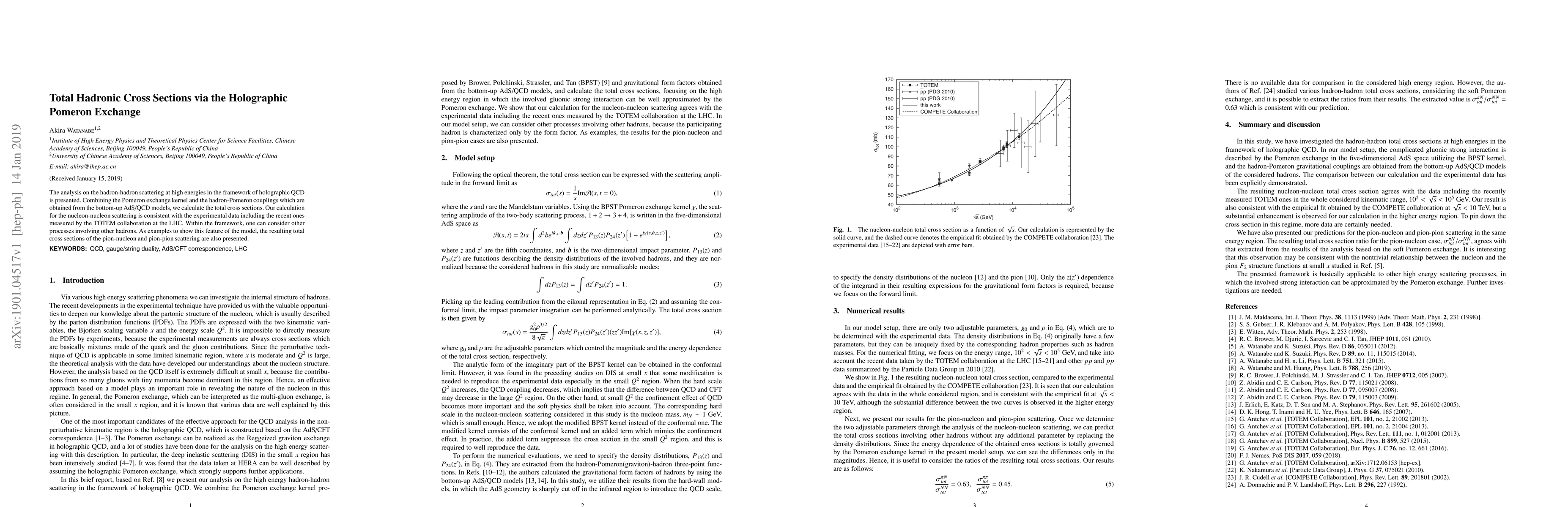 This paper calculates total hadronic cross sections for high-energy hadron-hadron scattering using holographic QCD and the Pomeron exchange model, showing agreement with recent experimental data from the TOTEM collaboration. The framework also extends to other hadron interactions, as demonstrated by the calculated pion-nucleon and pion-pion scattering cross sections.