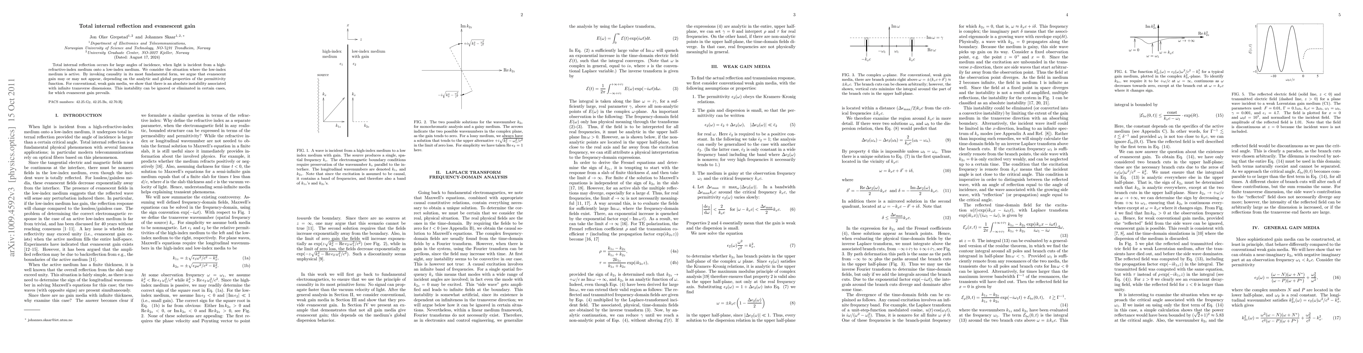 This paper explores total internal reflection in high-refractive-index to low-refractive-index medium transitions, particularly when the low-index medium is active. It argues that evanescent gain may occur depending on the properties of the permittivity function, revealing an absolute instability in conventional weak gain media that can sometimes be eliminated, allowing for evanescent gain.
