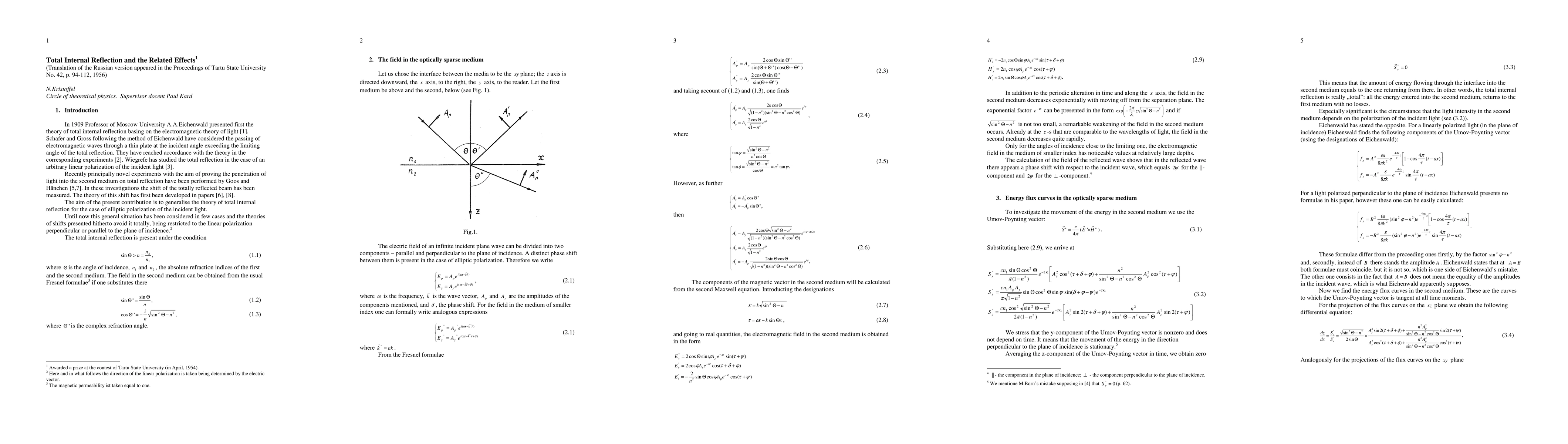 This submission presents the English translation of the early paper by N.Kristoffel appeared in Russian in the Proceedings 0f the Tartu State University No 42 p.94-112, 1956. It reflects the work done in Tartu State University (Estonia)1n 1950-s on the total internal reflection and associated effects. This paper can be of interest for the scientific community because it remained not well known during the long period. The conceptual paper of N.Kristoffel mentioned includes as the central result the prediction of the transversal shift of the totally reflected light beam.