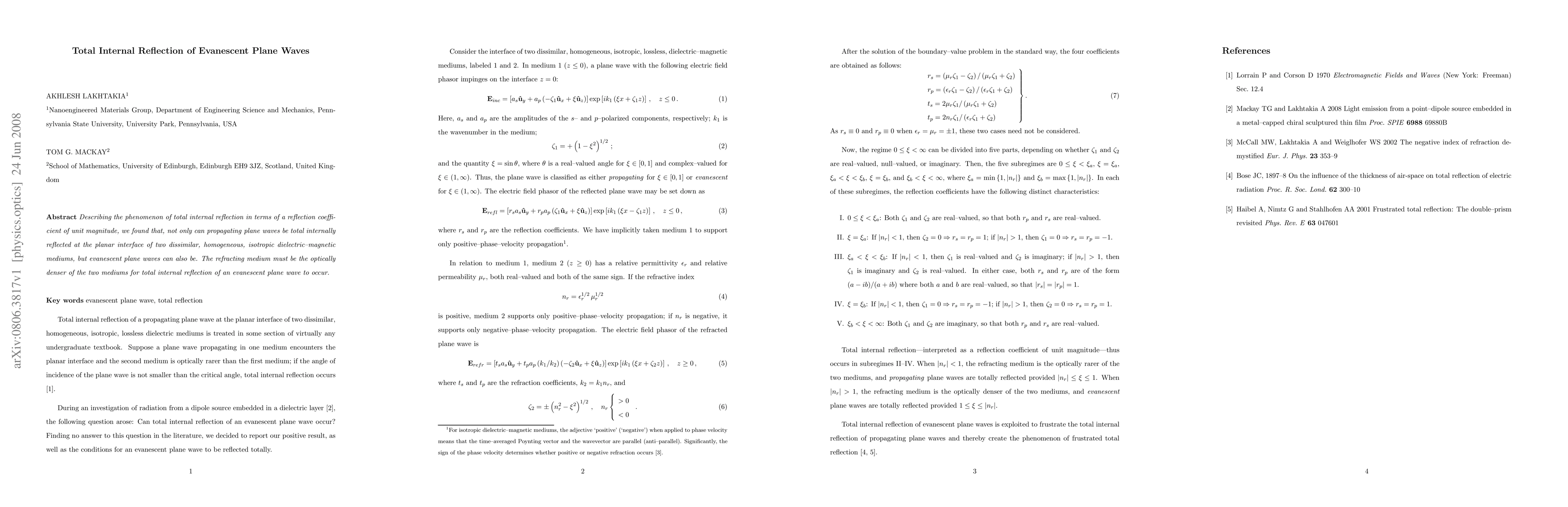 Describing the phenomenon of total internal reflection in terms of a reflection coefficient of unit magnitude, we found that, not only can propagating plane waves be total internally reflected at the planar interface of two dissimilar, homogeneous, isotropic dielectric-magnetic mediums, but evanescent plane waves can also be. The refracting medium must be the optically denser of the two mediums for total internal reflection of an evanescent plane wave to occur.