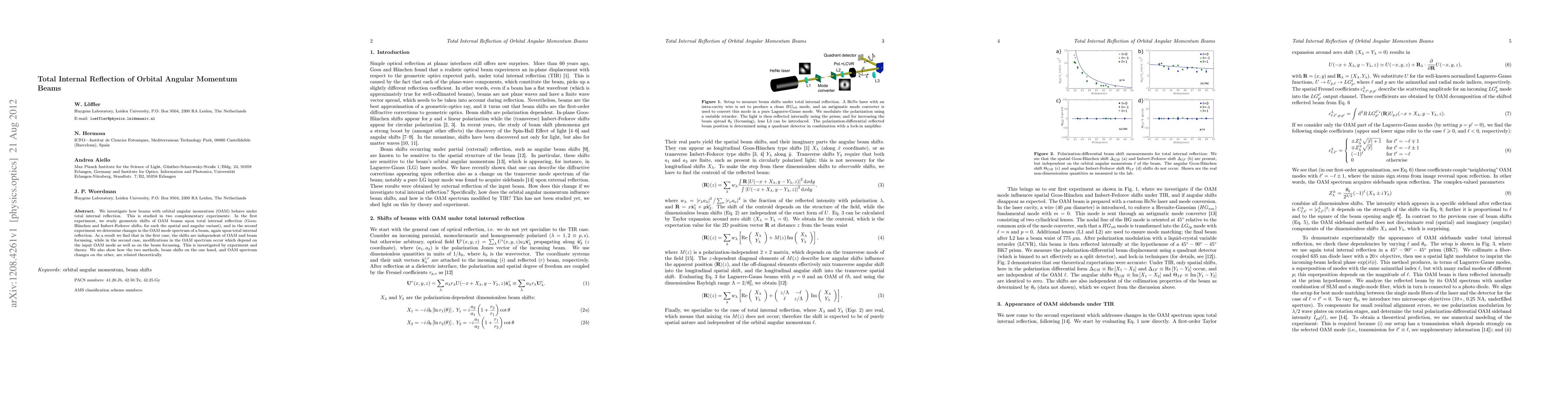 We investigate how beams with orbital angular momentum (OAM) behave under total internal reflection. This is studied in two complementary experiments: In the first experiment, we study geometric shifts of OAM beams upon total internal reflection (Goos-H\"anchen and Imbert-Fedorov shifts, for each the spatial and angular variant), and in the second experiment we determine changes in the OAM mode spectrum of a beam, again upon total internal reflection. As a result we find that in the first case, the shifts are independent of OAM and beam focussing, while in the second case, modifications in the OAM spectrum occur which depend on the input OAM mode as well as on the beam focussing. This is investigated by experiment and theory. We also show how the two methods, beam shifts on the one hand, and OAM spectrum changes on the other, are related theoretically.