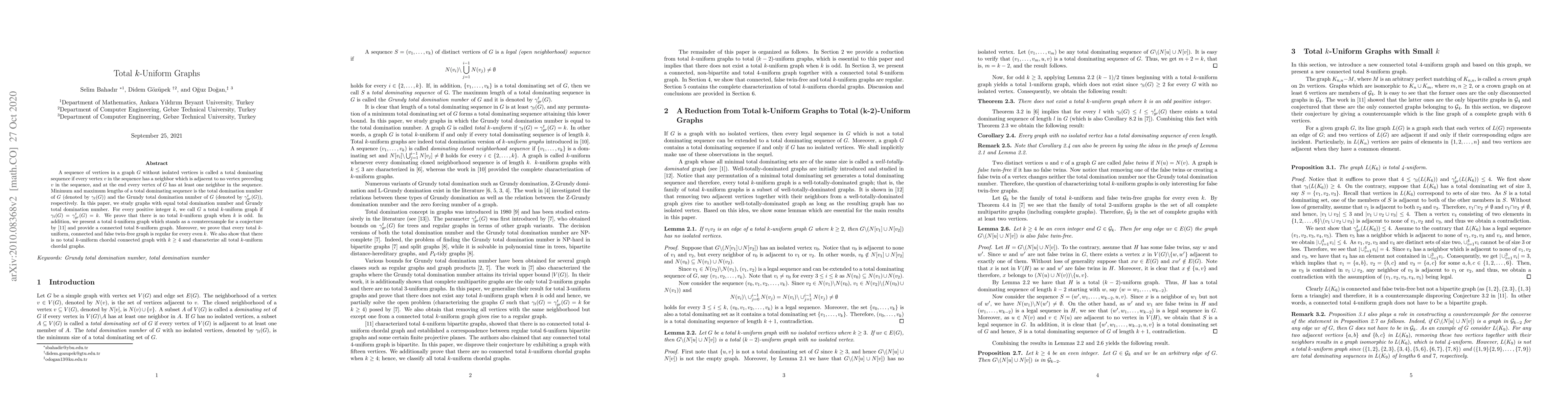 This paper explores graphs where the total domination number equals the Grundy total domination number, termed total $k$-uniform graphs. It proves the non-existence of total $k$-uniform graphs for odd $k$ and presents a total 4-uniform graph, along with a connected total 8-uniform graph. It also establishes that total $k$-uniform, connected, and false twin-free graphs are regular for even $k$, and demonstrates the non-existence of total $k$-uniform chordal connected graphs for $k\geq 4$.