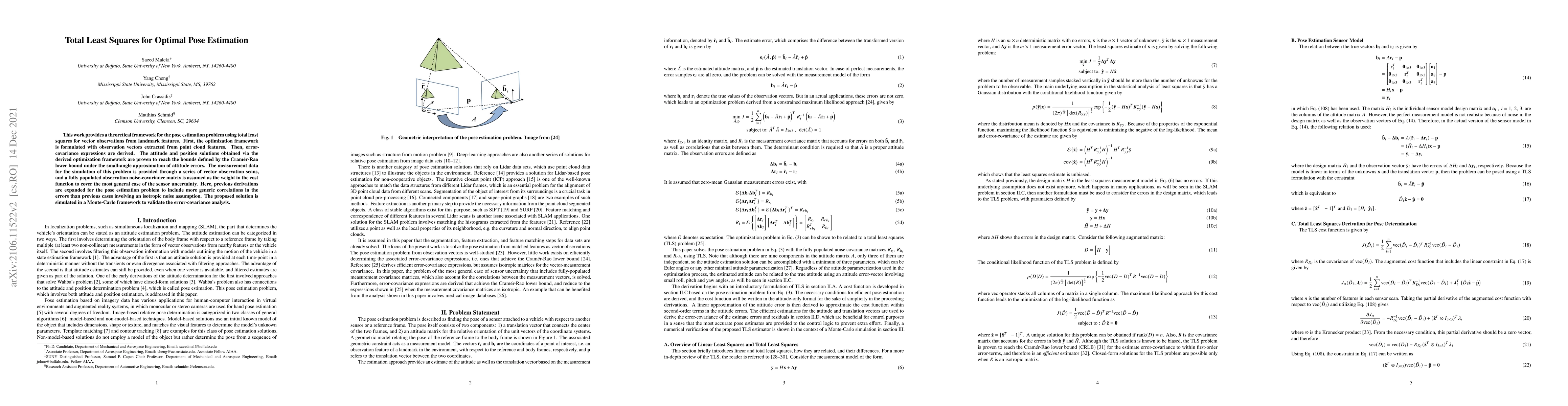 This paper develops a theoretical framework for optimal pose estimation using total least squares, deriving error-covariance expressions and proving the solutions reach the Cramér-Rao lower bound under small-angle approximations. The method is validated through Monte-Carlo simulations considering general sensor uncertainties.