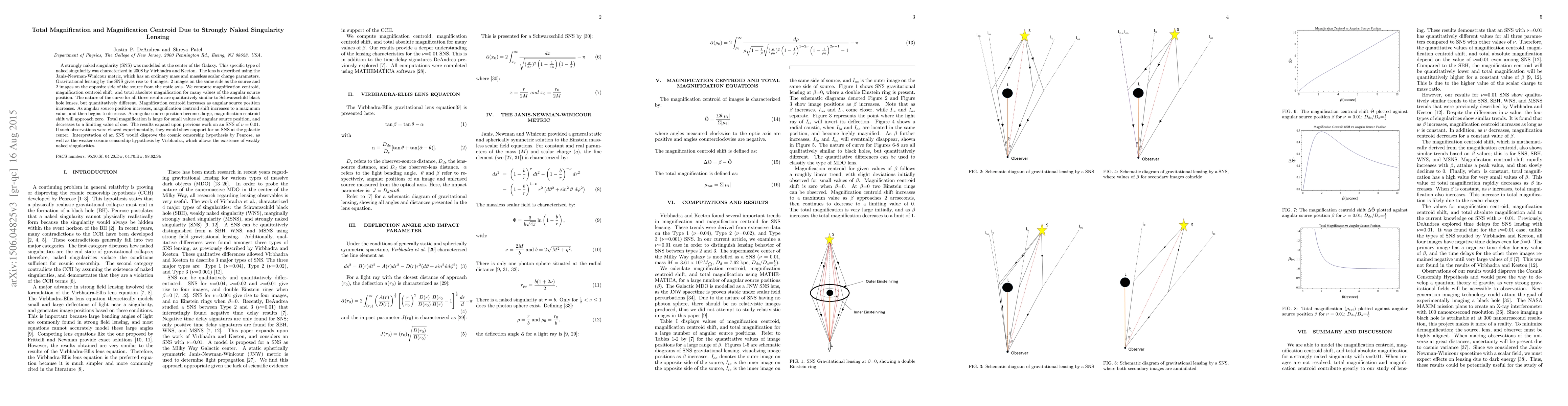 A strongly naked singularity (SNS) was modelled at the center of the Galaxy. This specific type of naked singularity was characterized in 2008 by Virbhadra and Keeton. The lens is described using the Janis-Newman-Winicour metric, which has an ordinary mass and massless scalar charge parameters. Gravitational lensing by the SNS gives rise to 4 images: 2 images on the same side as the source and 2 images on the opposite side of the source from the optic axis. We compute magnification centroid, magnification centroid shift, and total absolute magnification for many values of the angular source position. The nature of the curve for all three results are qualitatively similar to Schwarzschild black hole lenses, but quantitatively different. Magnification centroid increases as angular source position increases. As angular source position increases, magnification centroid shift increases to a maximum value, and then begins to decrease. As angular source position becomes large, magnification centroid shift will approach zero. Total magnification is large for small values of angular source position, and decreases to a limiting value of one. The results expand upon previous work on an SNS of {\nu}=0.01. If such observations were viewed experimentally, they would show support for an SNS at the galactic center. Interpretation of an SNS would disprove the cosmic censorship hypothesis by Penrose, as well as the weaker cosmic censorship hypothesis by Virbhadra, which allows the existence of weakly naked singularities.