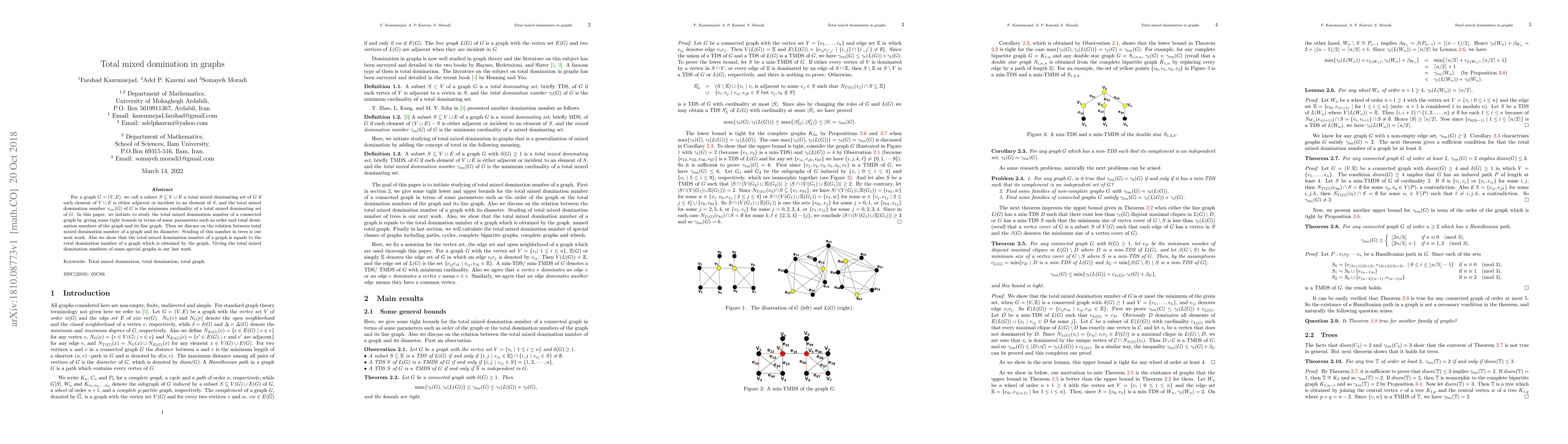 This paper introduces the concept of total mixed dominating sets in graphs, defines the total mixed domination number, and provides tight bounds for it based on graph parameters. It also explores the relationship between this number and the graph's diameter and identifies next steps to study trees and special graph types.